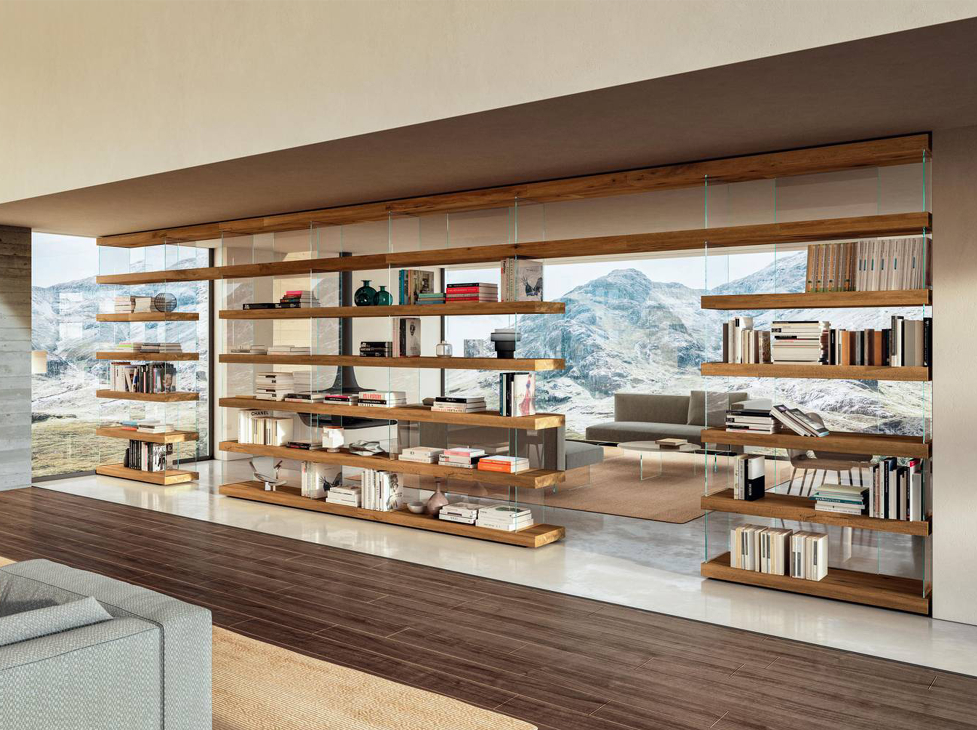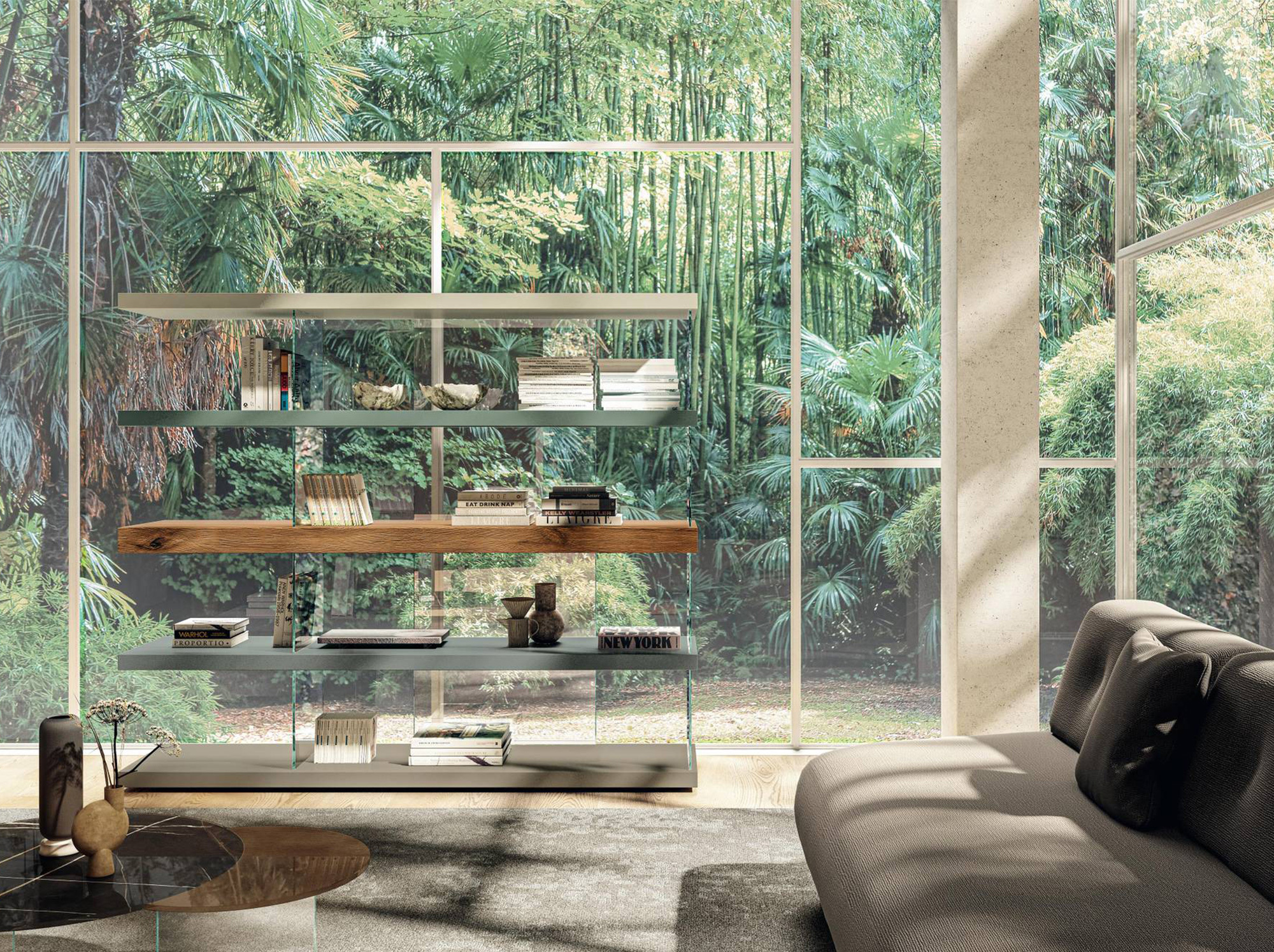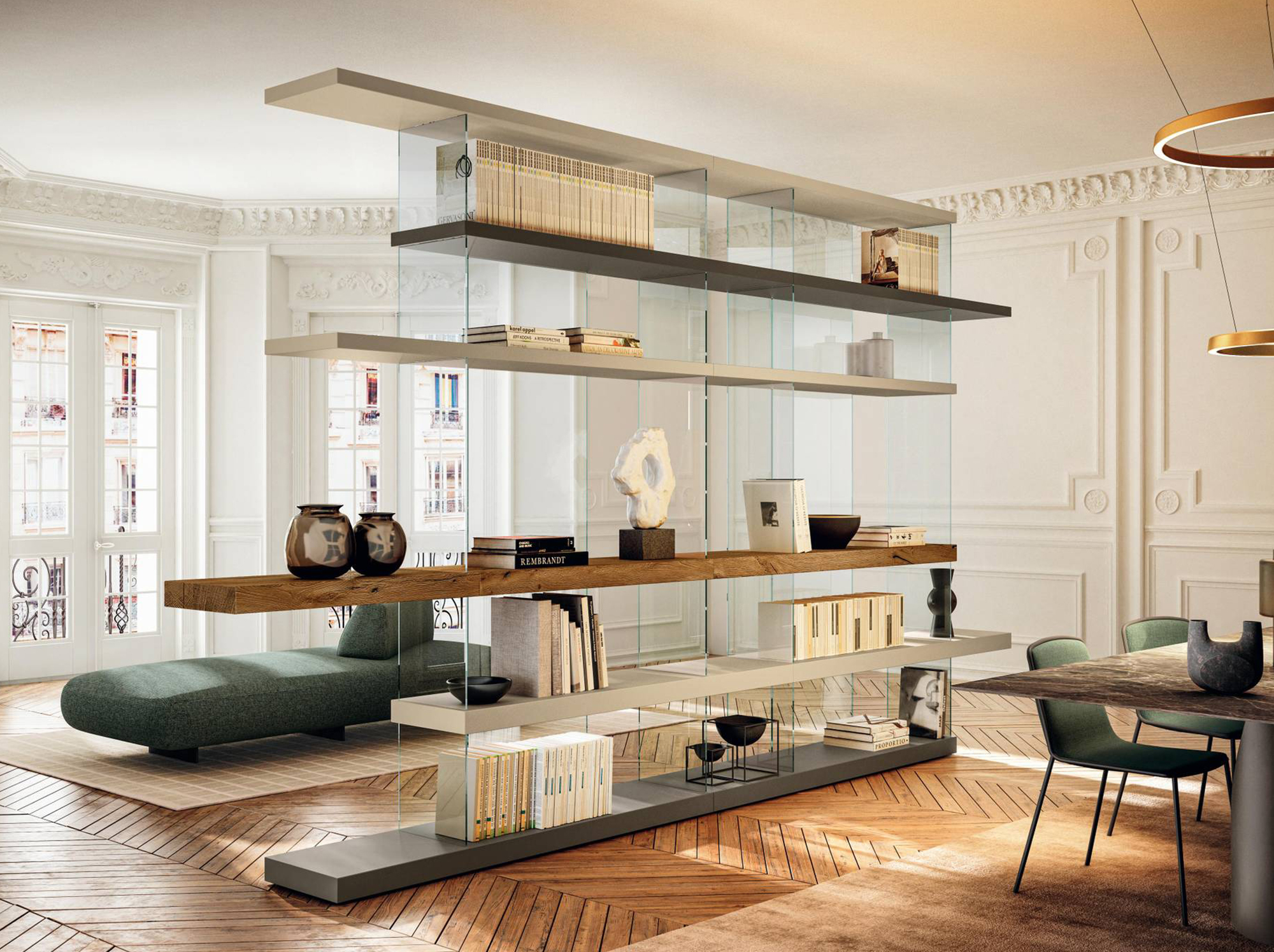 層架可依喜好不規則左右排列、對齊或交錯,它像是一座行動書架,你可以隨時靈活調整家中佈局,利用書架雙面性,玻璃透視引光入室,擺放至開放式空間置頂隔間,自然的劃分出各自不干擾的機能氛圍,搭配舒適懶人沙發與落地燈,是一個安靜的閱讀角落,客廳裡層架和電視牆搭配組合架上展示著精緻的古董與珍藏,書架甚至可以與書桌L型相連,絕妙劃分出私人辦公區域,也可區隔開闊的客廳與廚房,透過玻璃視覺穿透一眼望去,在廚房做菜也可以安心看照孩子,陽光灑落屋內與家人共度溫暖美好時光,放置在大片落地窗前又能享受後方風景微妙的變化,如畫的視覺饗宴是生活場景迷人之處。