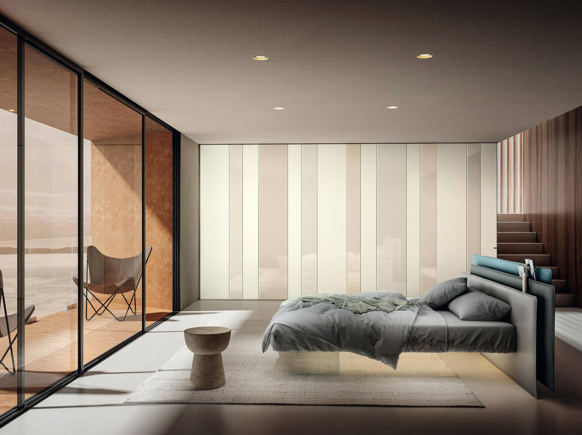 Air 系列為臥室添增一抹現代與舒適氛圍,跳脫制式的傳統框架,在床頭板與床腳處進行了創新,床頭板採用壁掛式或獨立式設計,搭配功能性床頭櫃一起使用,床架與透明鋼化玻璃的微妙垂直結構支撐,隱形的設計使床墊若有似無彷彿漂浮在空中,優雅、輕盈而美好,以輕量化的方式詮釋空間的可能性,視覺與使用性上達到完美的平衡。