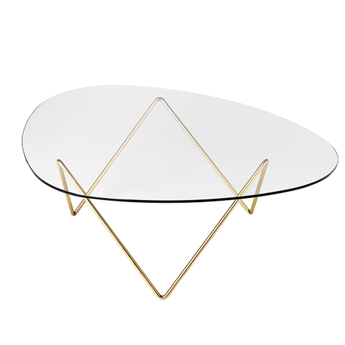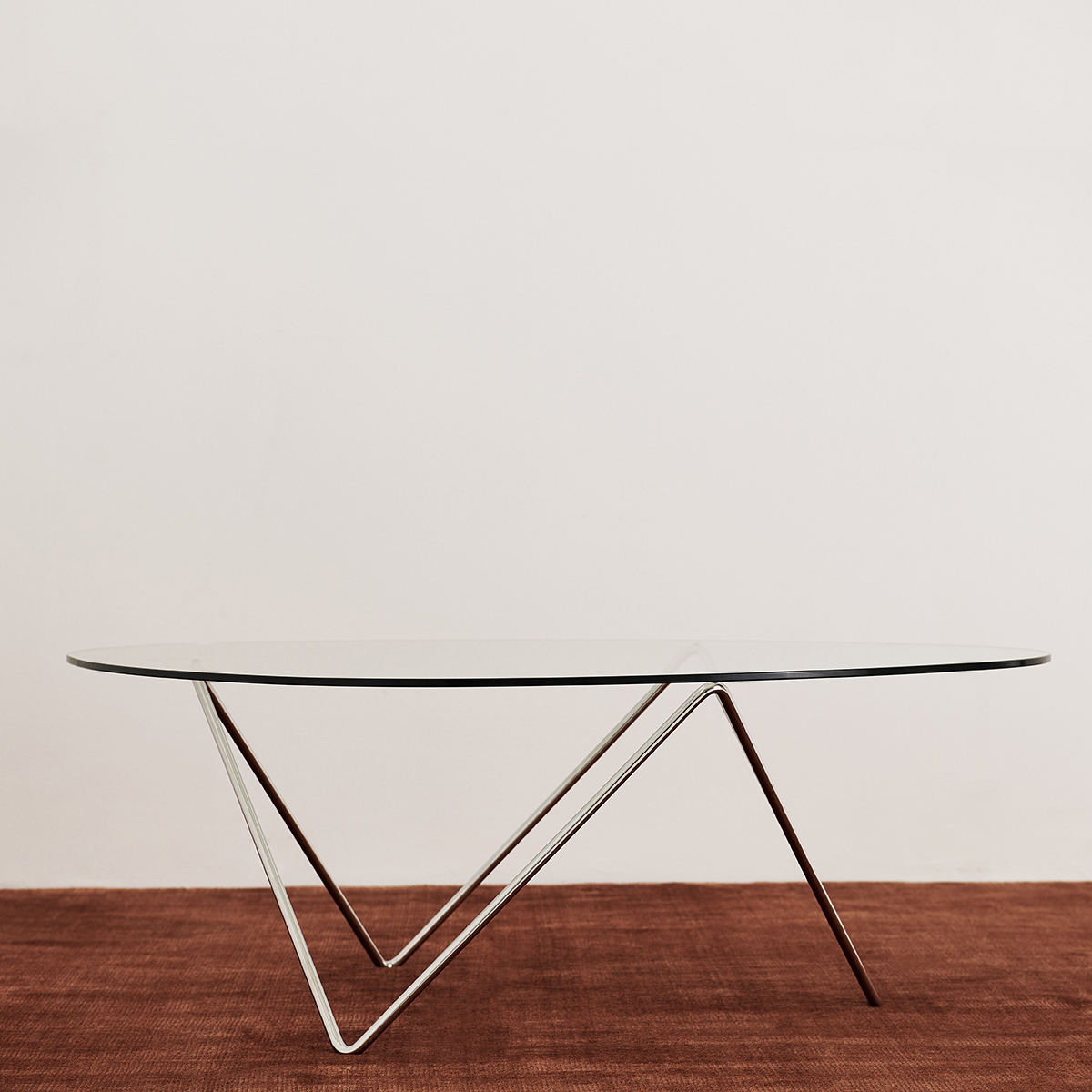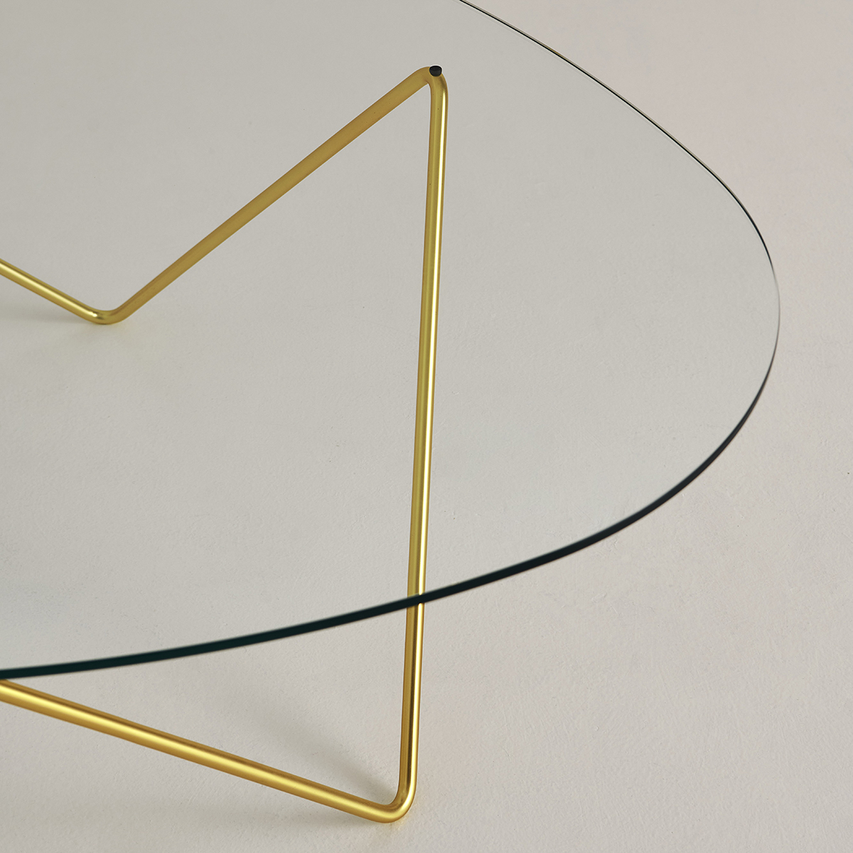 Pedrera 咖啡桌由透亮玻璃桌板與俐落金屬桌腳組成
