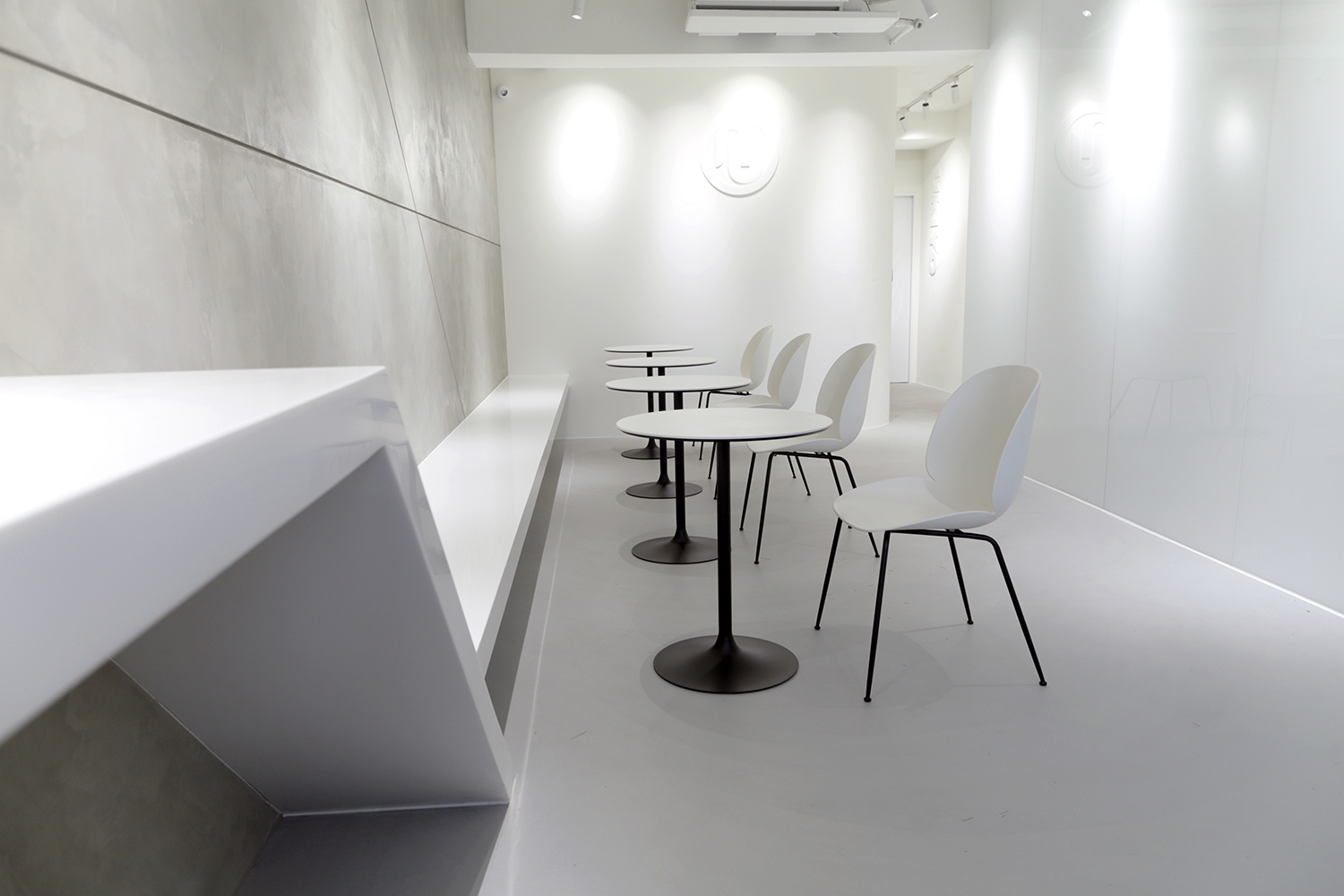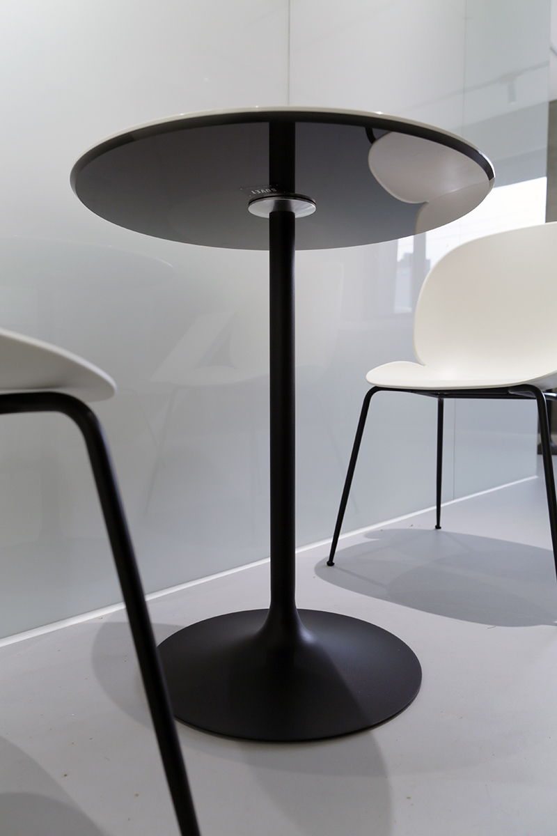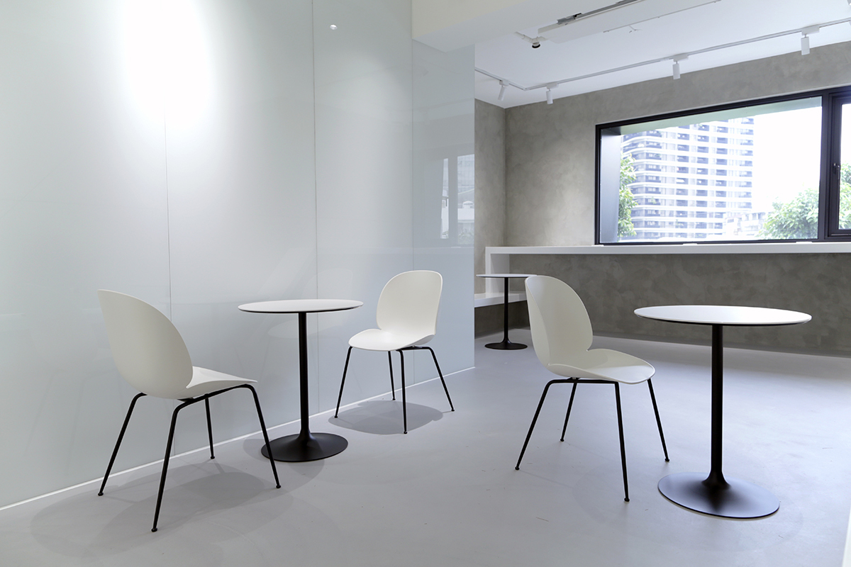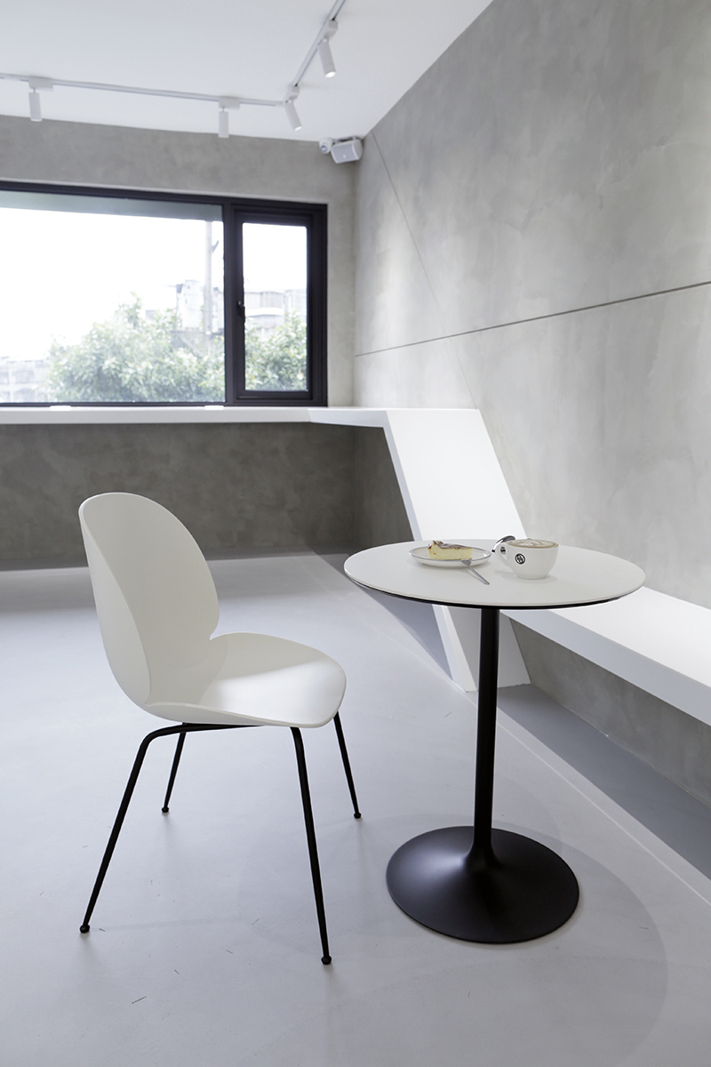 纖細椅腳的Beetle 塑料餐椅搭配幾何輪廓的Flute Bar 餐桌