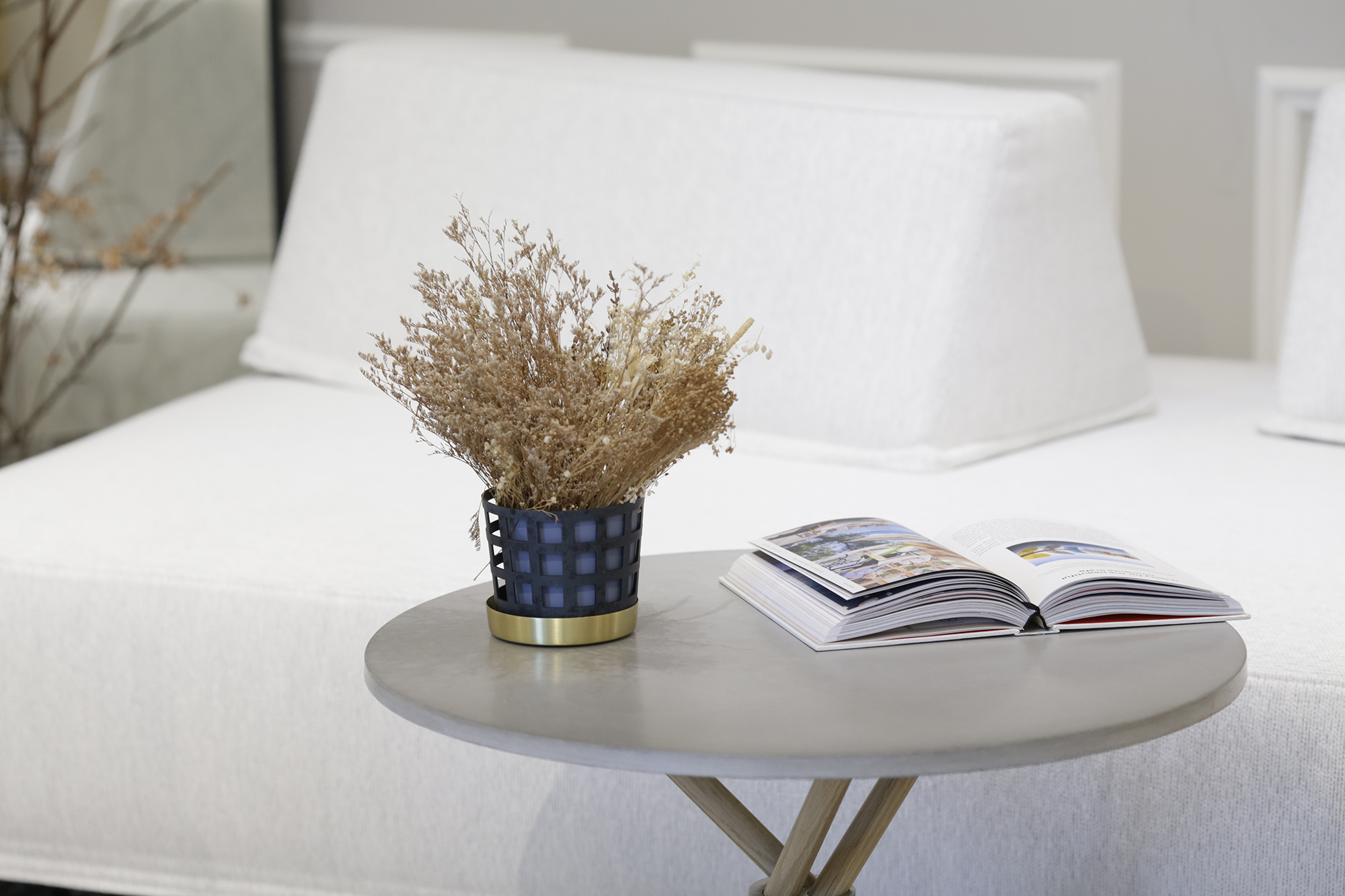 堅固穩重的水泥桌板與柔軟的布質沙發為空間堆疊出層次分明的感受