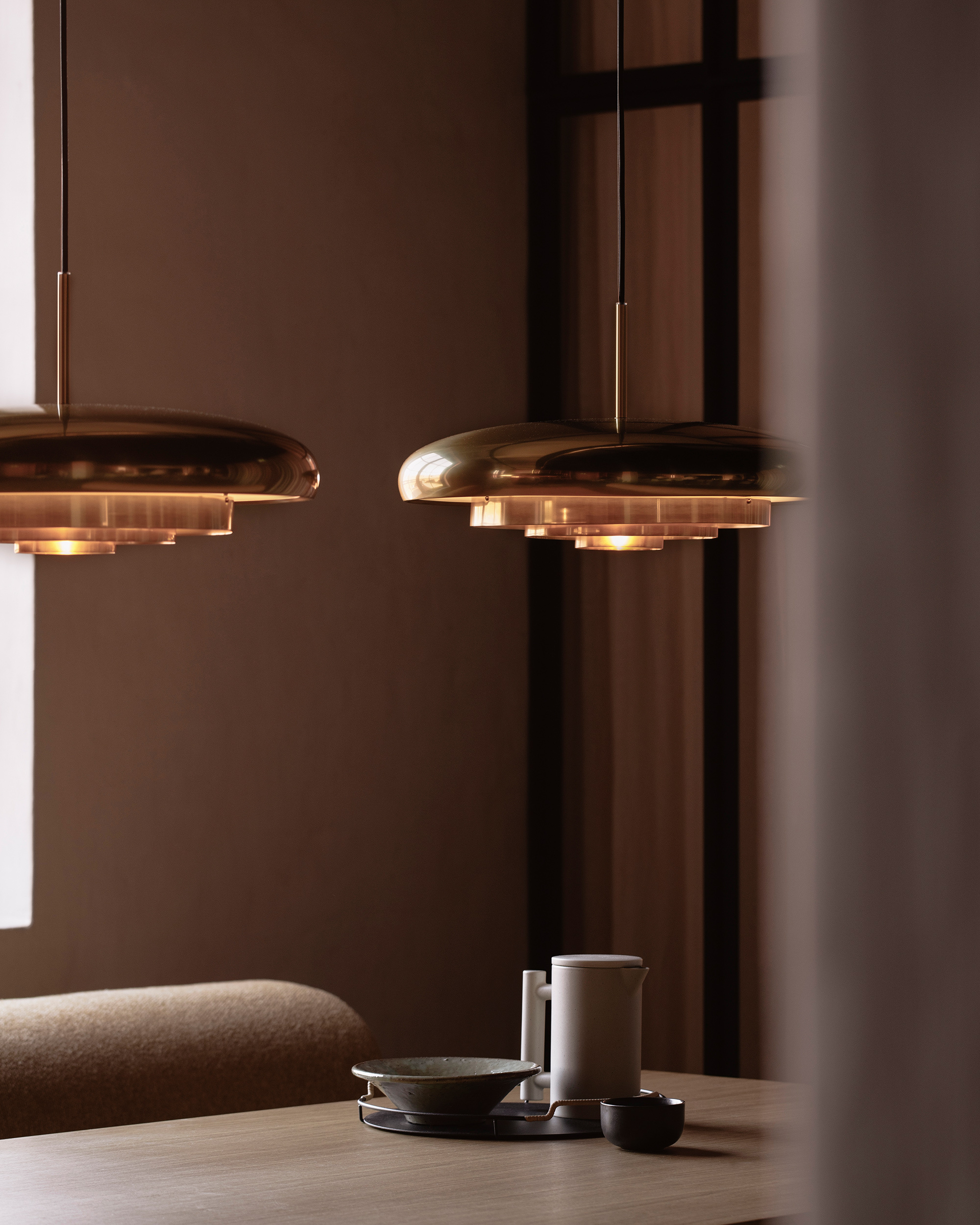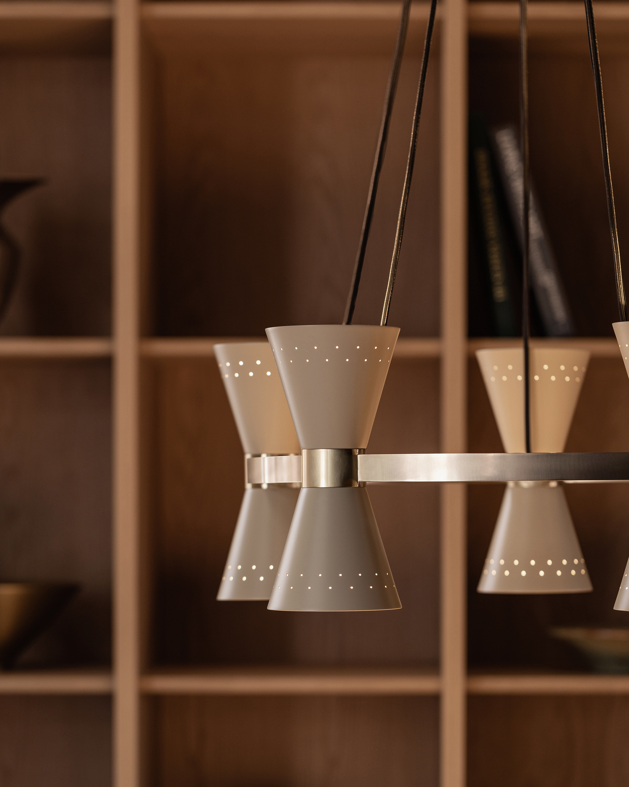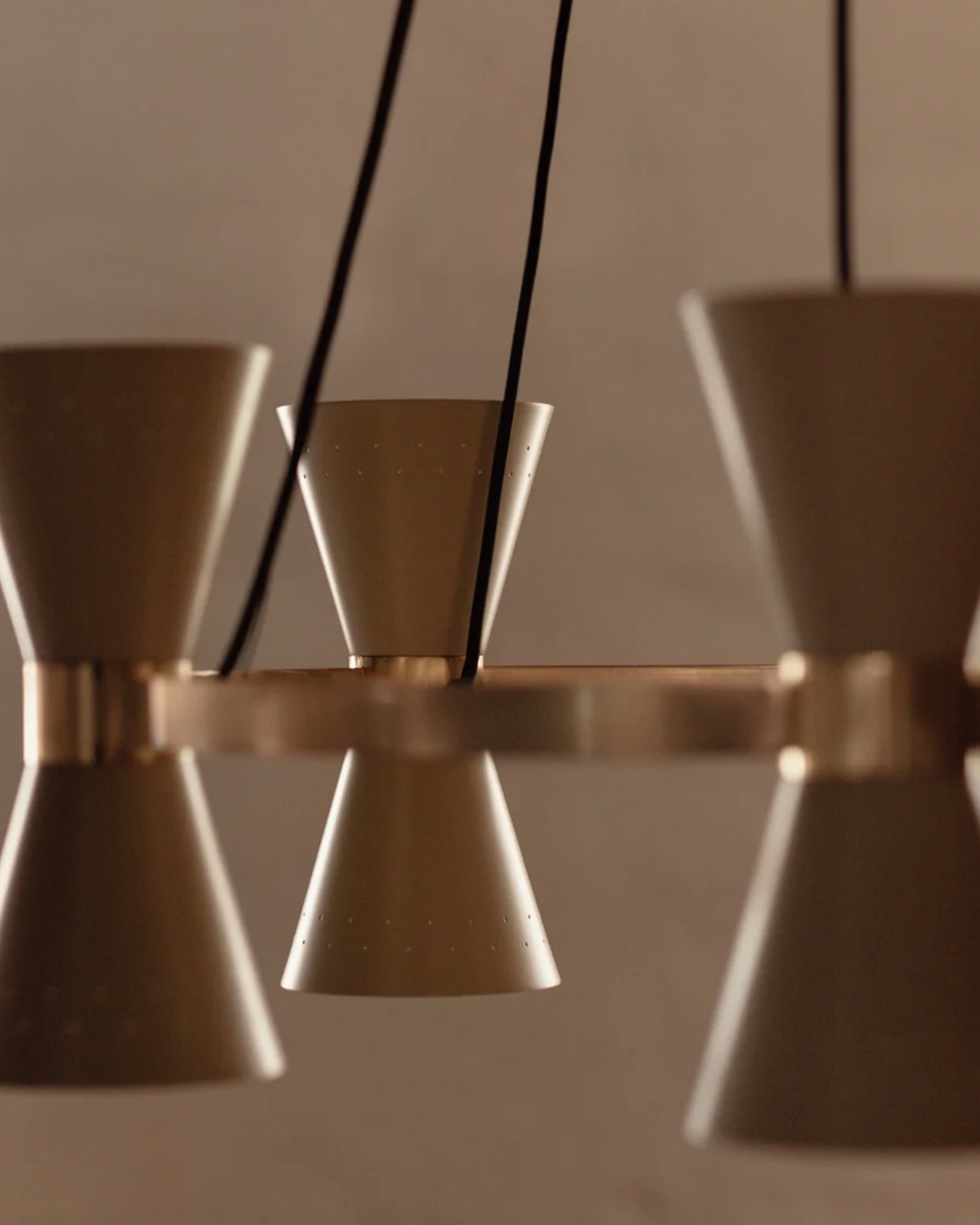 這款中世紀吊燈外觀設計俐落既引人注目,象徵北歐燈飾的標誌,吊燈由拋光黃銅製成,形成四個同心燈罩,向下引導無眩光的光線,其彎曲的拋光黃銅燈罩發出的燈光能在任何環境中營造氛圍。它的名字暗示了光和聲音之間的視覺相互作用,從閃亮的表面反射並在整個房間迴響。