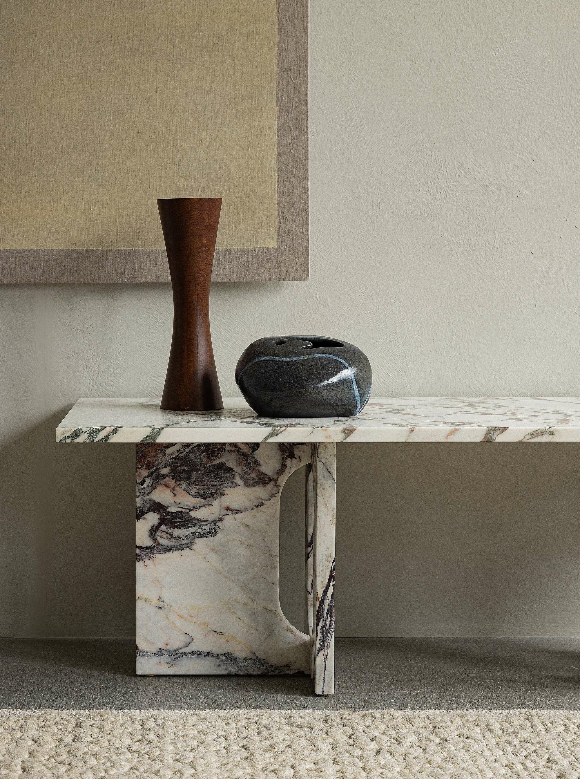 Androgyne 長型茶几,以獨特的紋理和溫暖色調的礦物碎片為標誌,延續了該系列的簡約輪廓設計,同時引入了天然材料以及適合日常環境的形狀和功能。多功能設計使其可以用作休閒桌或長凳,放置成堆的書籍或個性裝飾品。