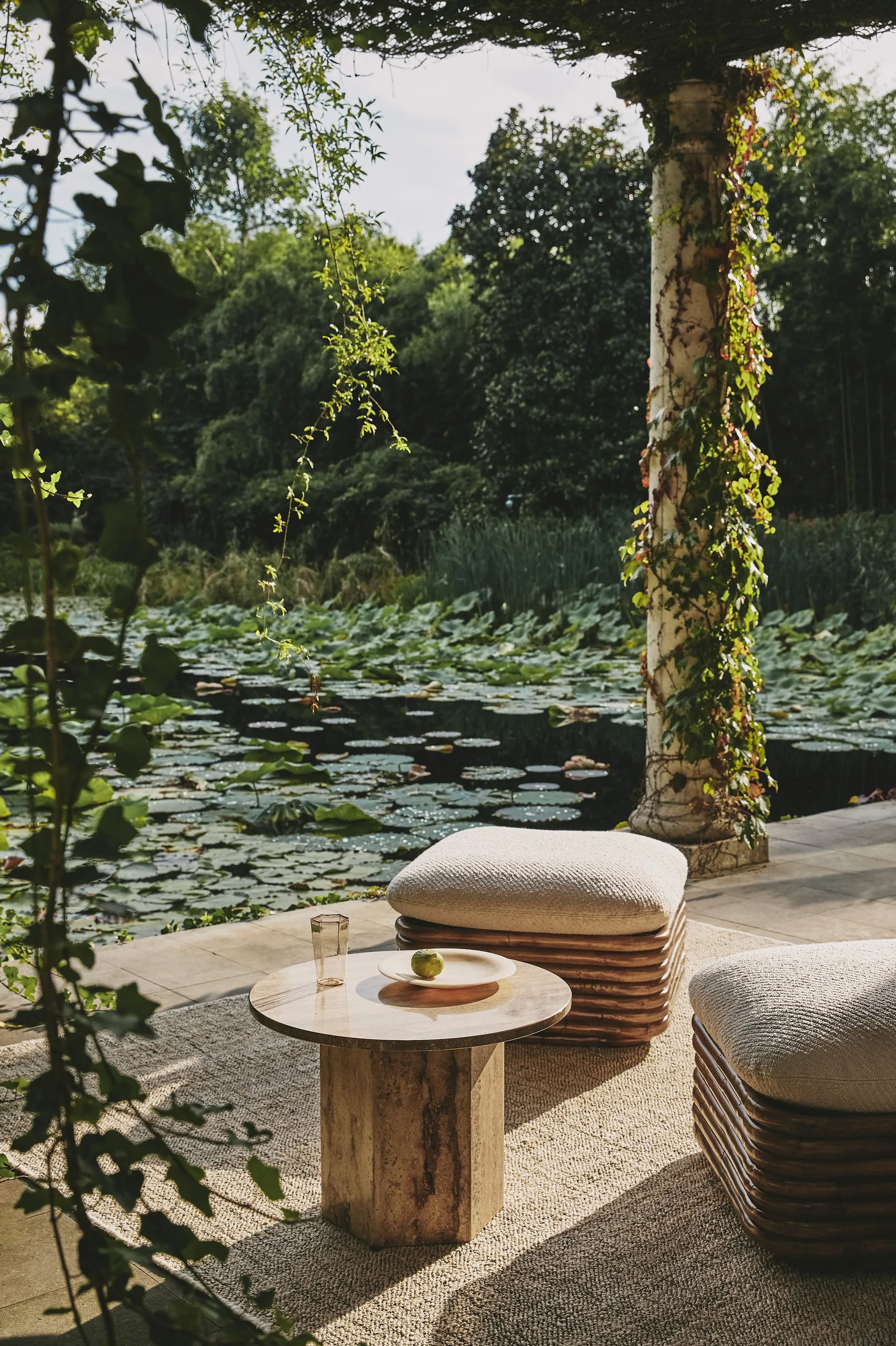 層層堆疊的藤條構成了休閒椅、三人座沙發和腳凳的底座,落地燈則是由藤條垂直排列而成,帶有黃銅細節。 條狀圖案使燈能夠在周圍的地板上投射出美麗細膩的光線和陰影,喚起了質樸的溫暖和波西米亞精緻的氛圍。