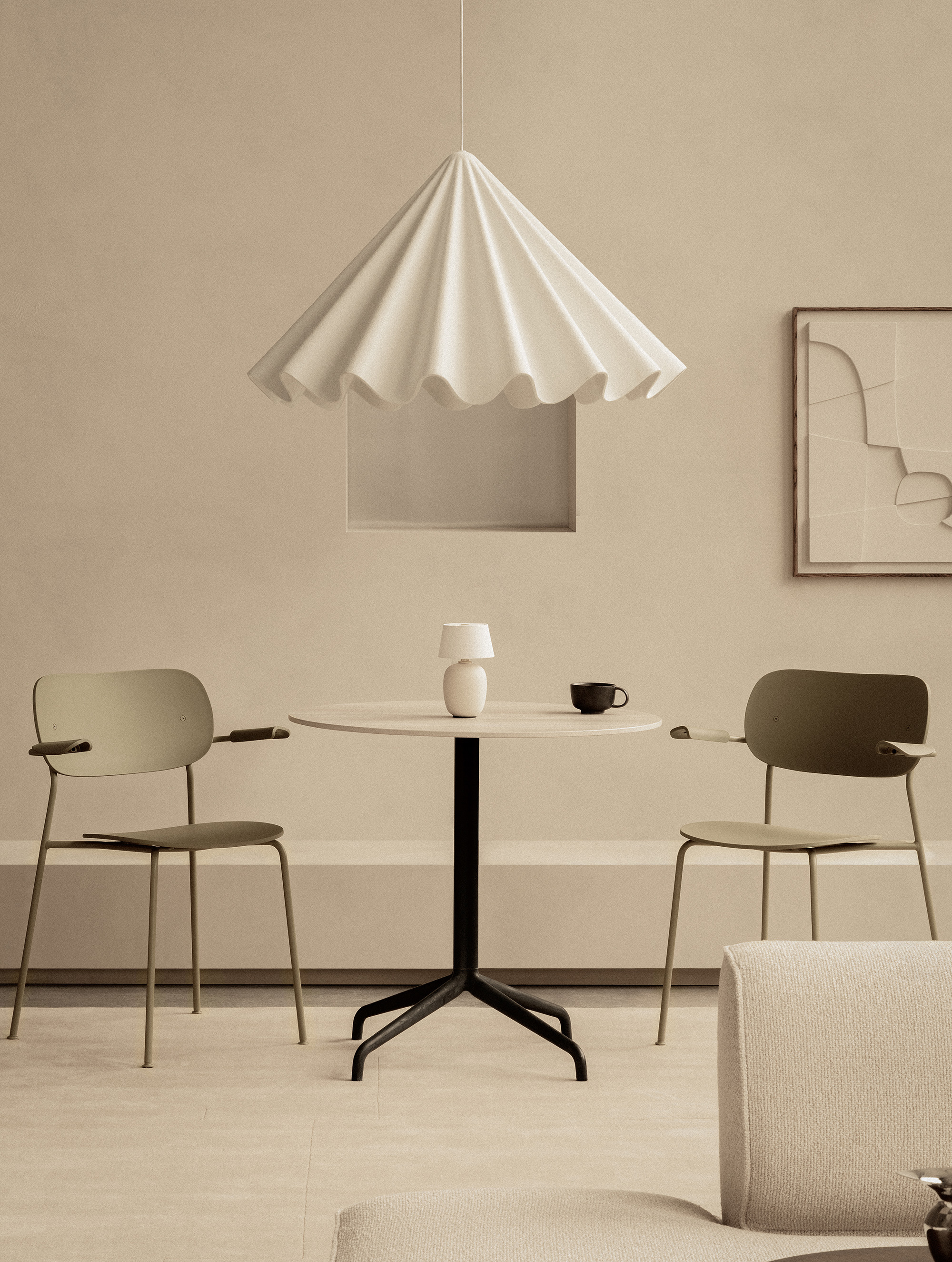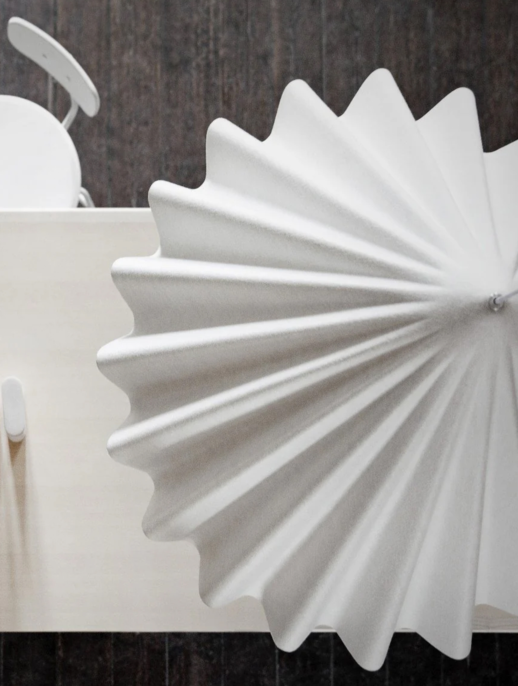 哥本哈根設計二人組 Iskos-Berlin 認為,設計是一門講故事的藝術,他們為 Audo Copenhagen 設計的舞動吊燈,將這項原則付諸實踐。這款吊燈富有表現力、燈光精緻而又不失俏皮,其設計靈感來自舞者旋轉時飄揚的百褶裙,精緻而有趣的曲線,中間呈喇叭形,這創意不斷演變,最終呈現出精確有序而又柔和流暢的形式。Dancing 吊燈由一種100%可回收材料製成,主要由用過的水瓶製成的氈織物製品,他們致力於永續發展的設計。
