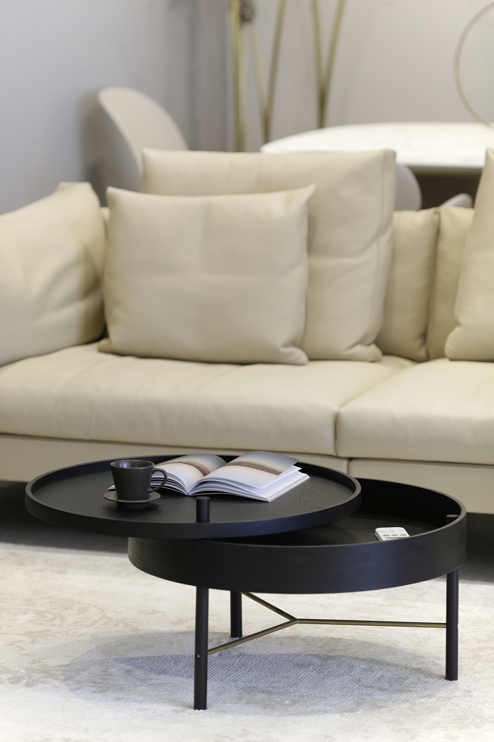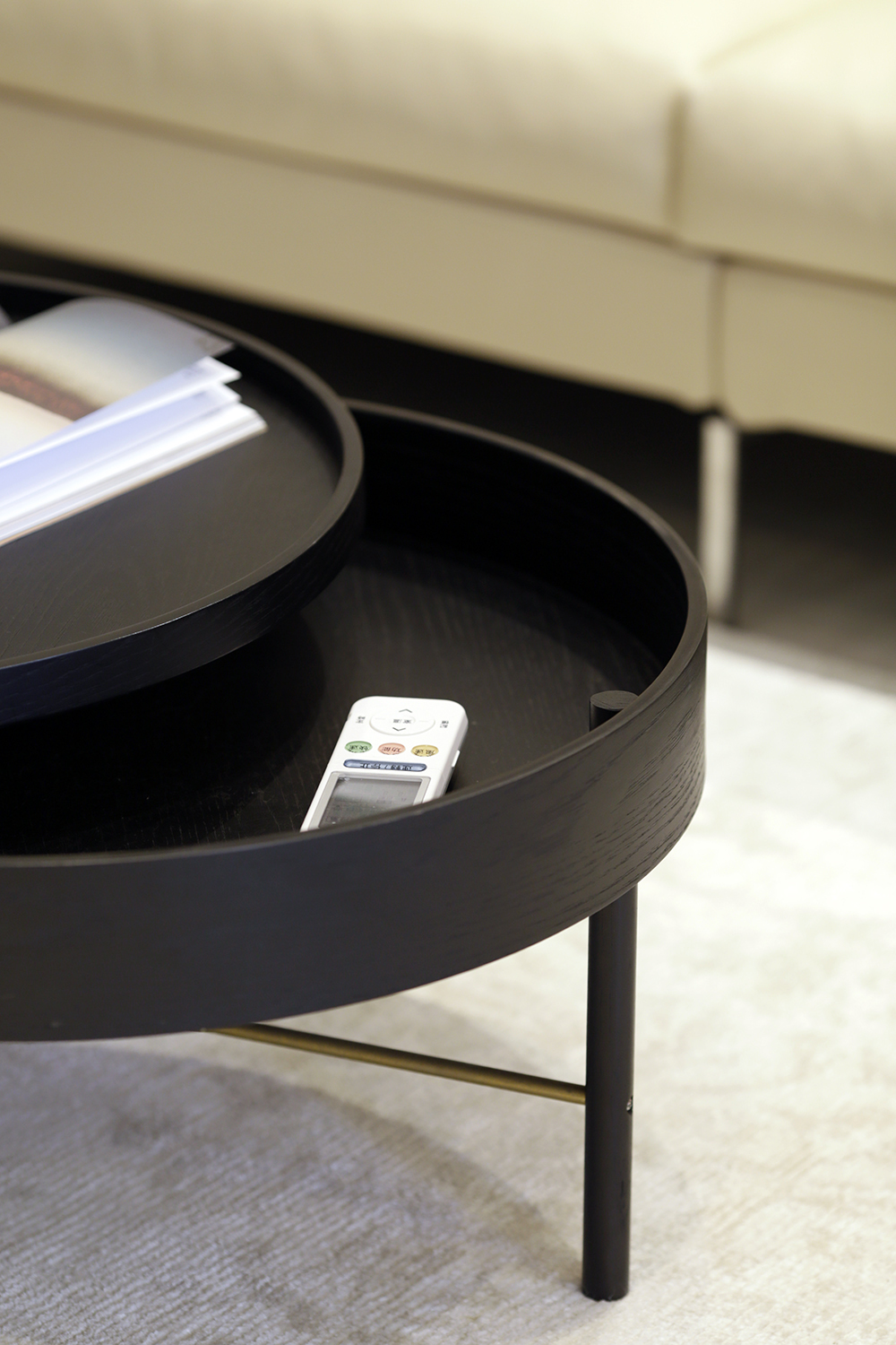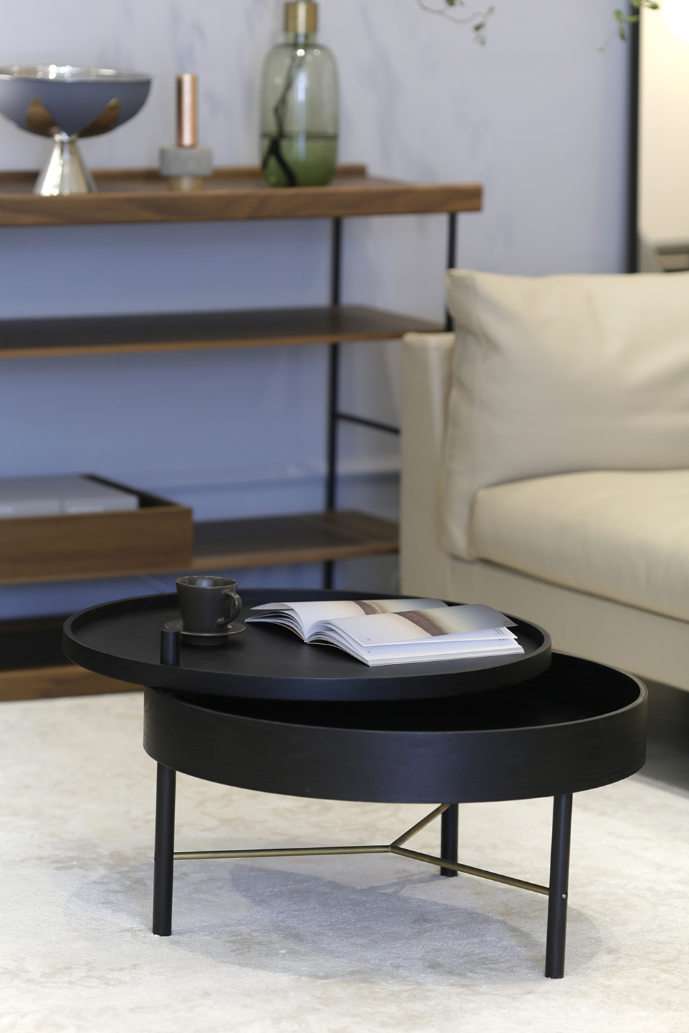 只需輕輕旋轉其中一片半圓桌板就能從茶几變為儲櫃使用