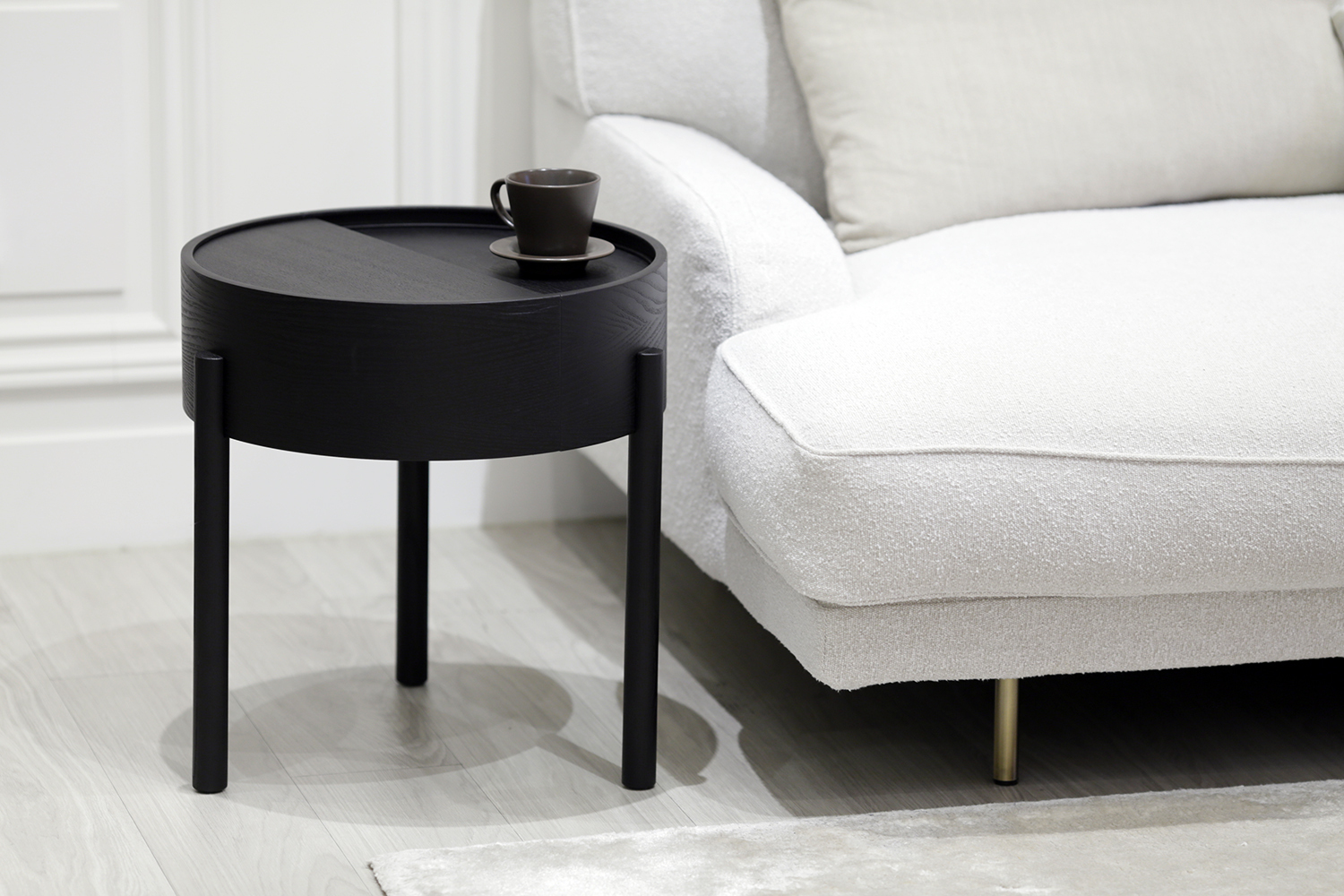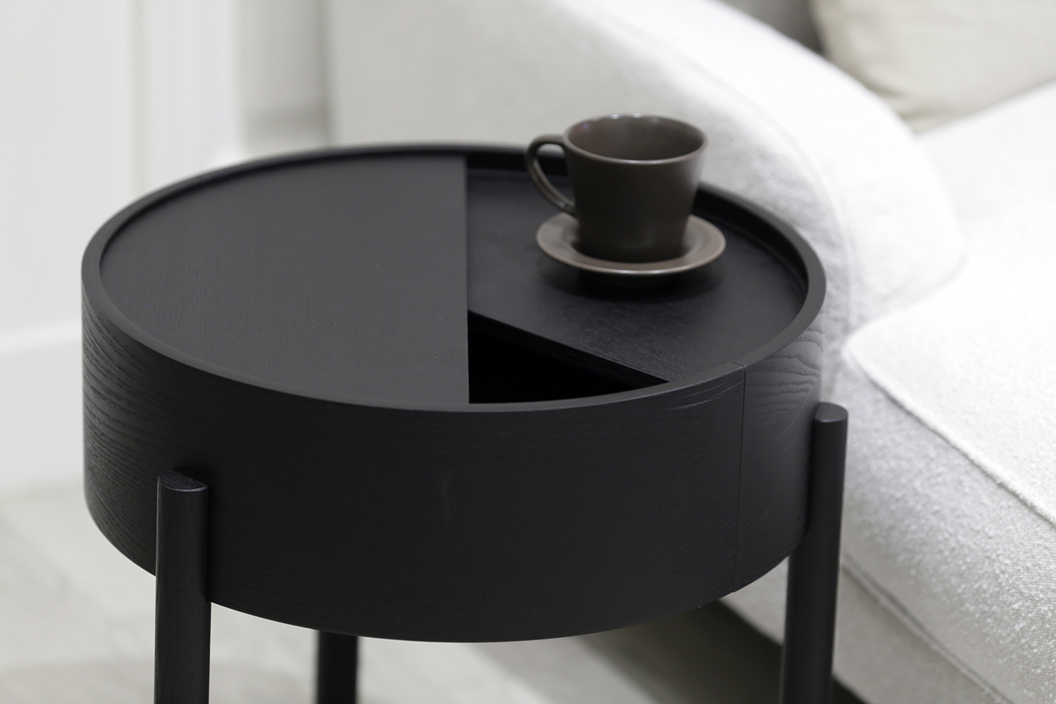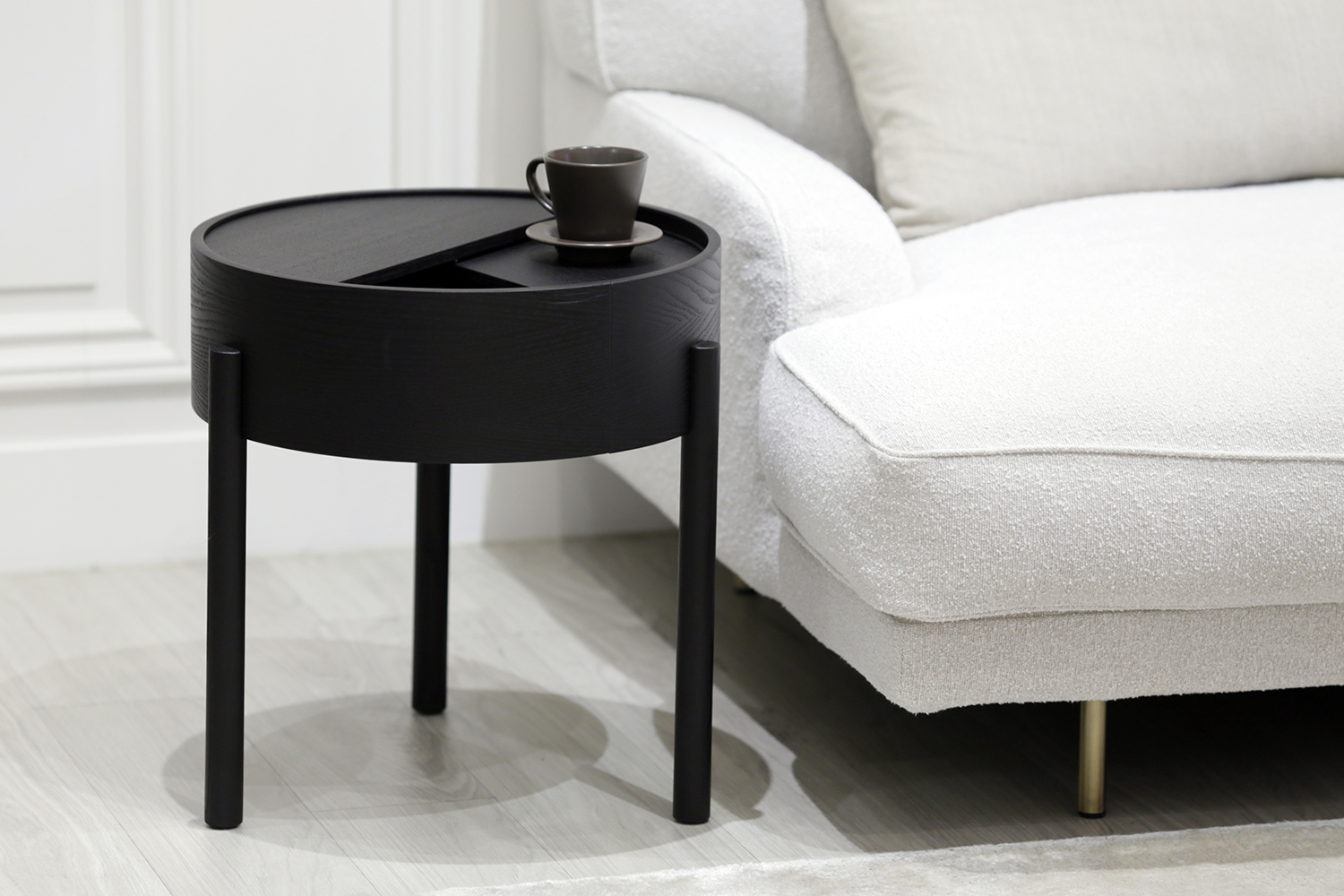 只需輕輕旋轉其中一片半圓桌板就能從茶几變為儲櫃使用