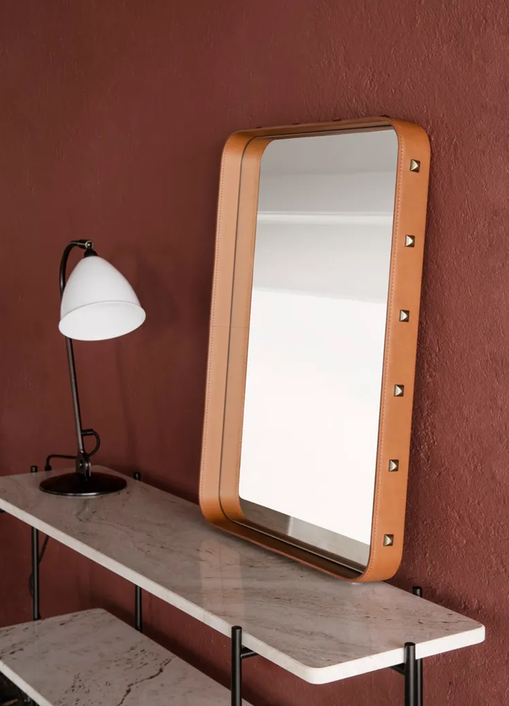 Adnet 矩形牆鏡是一款既經典又高級的設計!手工皮革鑲飾釘,邊緣拋光黃銅鉚釘,簡約中透著奢華氣質。不論是水平掛、垂直掛,還是隨性靠在牆上,它都能完美勝任,走廊、浴室、更衣室通通不在話下!這面鏡子不只反射光線,還能增添空間深度,瞬間讓視野變大,魅力值飆升!