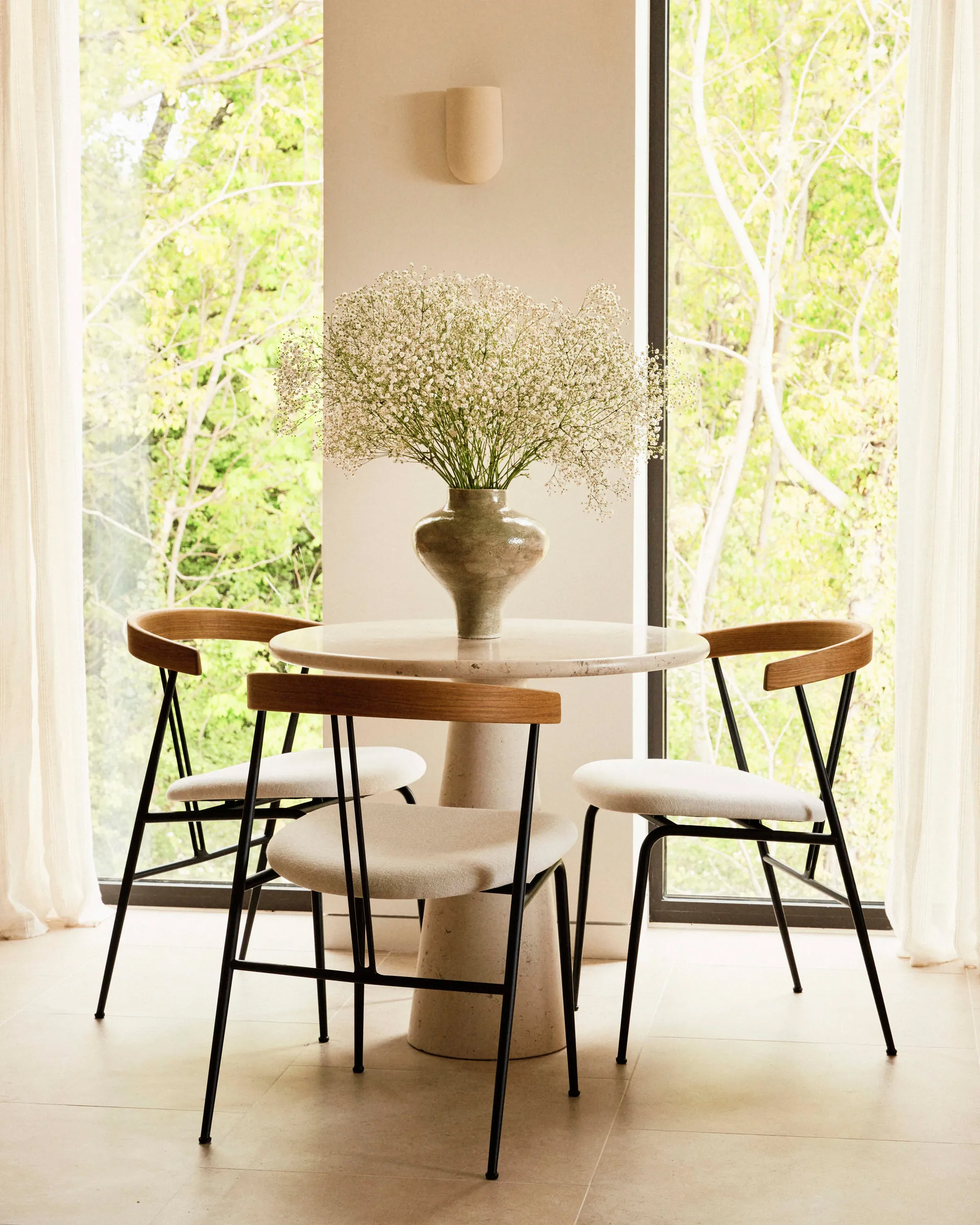 這款餐椅融合了純粹工藝與大膽創造力,椅背延伸出的平行線象徵小提琴的琴弦,支撐起柔和曲線的寬大座椅。環繞式半臂靠背提供穩固支撐,古典與現代元素形成鮮明對比。