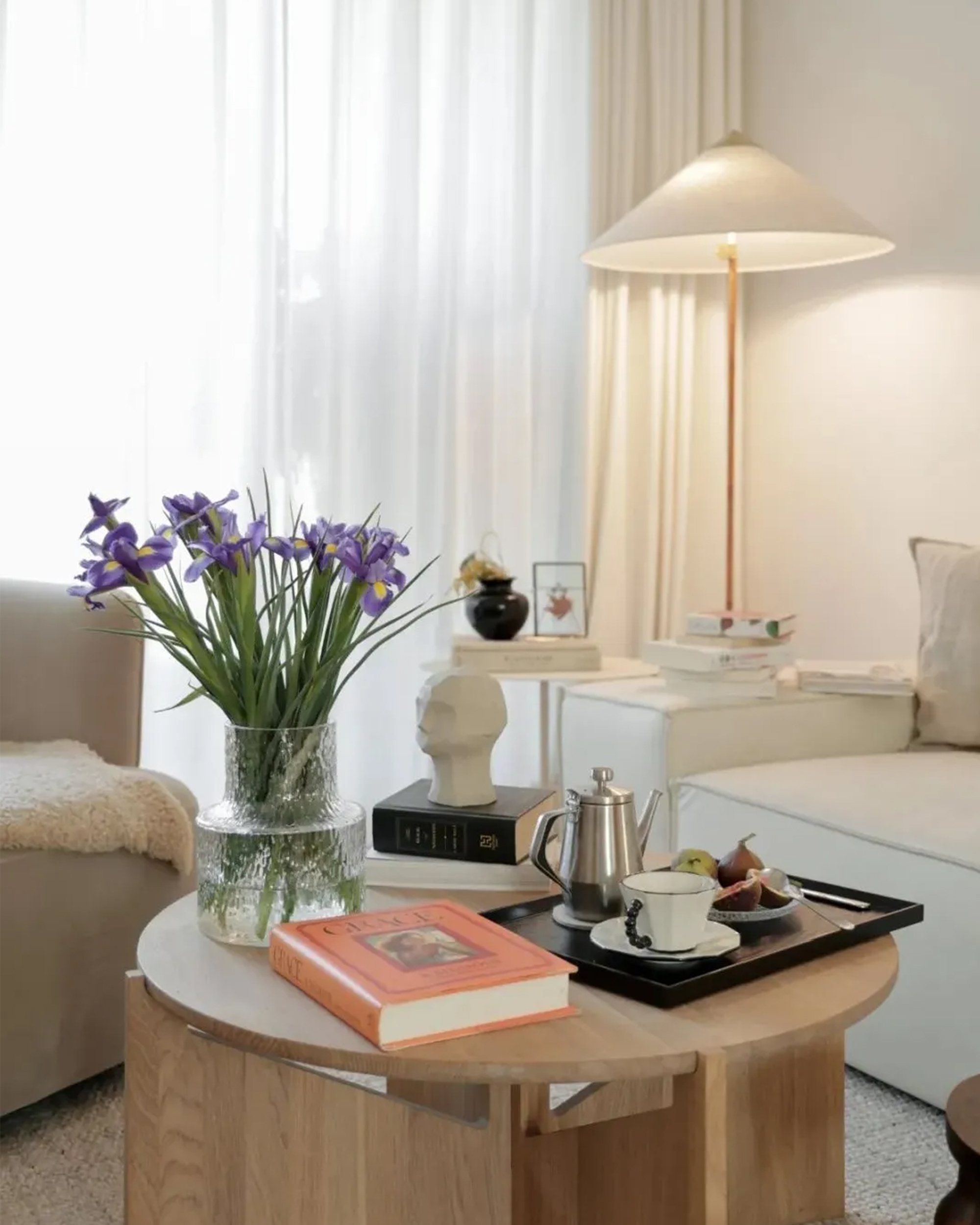 Multi-Lite 落地燈:隨便轉轉燈罩,客廳秒變舞台,今天暖光明天聚光,隨時應付 Kim 的拍攝需求。TS 茶几:別看它腿細,放再多咖啡杯也穩如泰山,還能靠金屬線條撩人視線。