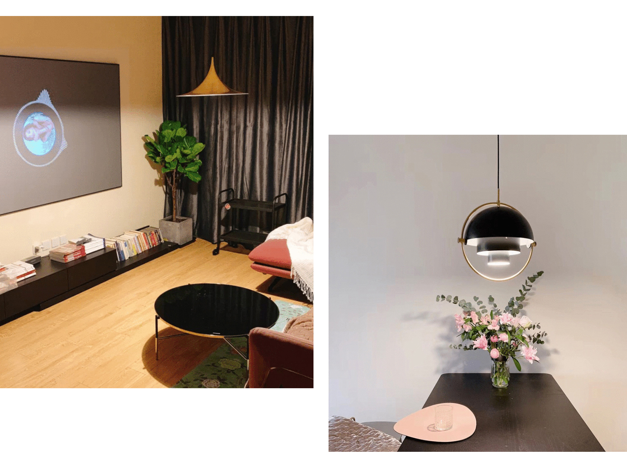 陽光彩虹小白馬的家裡有兩盞被譽為“ 燈界童話角色 ”的作品 Multi-Lite 吊燈與 Semi 吊燈。Multi-Lite 燈的魔力:每天輕輕旋轉,彷彿化身旋轉木馬;而 Semi 吊燈流暢弧線,就像童話中的小精靈,輕巧地跳進她的餐廳。她家裡每天都有魔法發生,彷彿住在迪士尼的夢幻城堡裡。