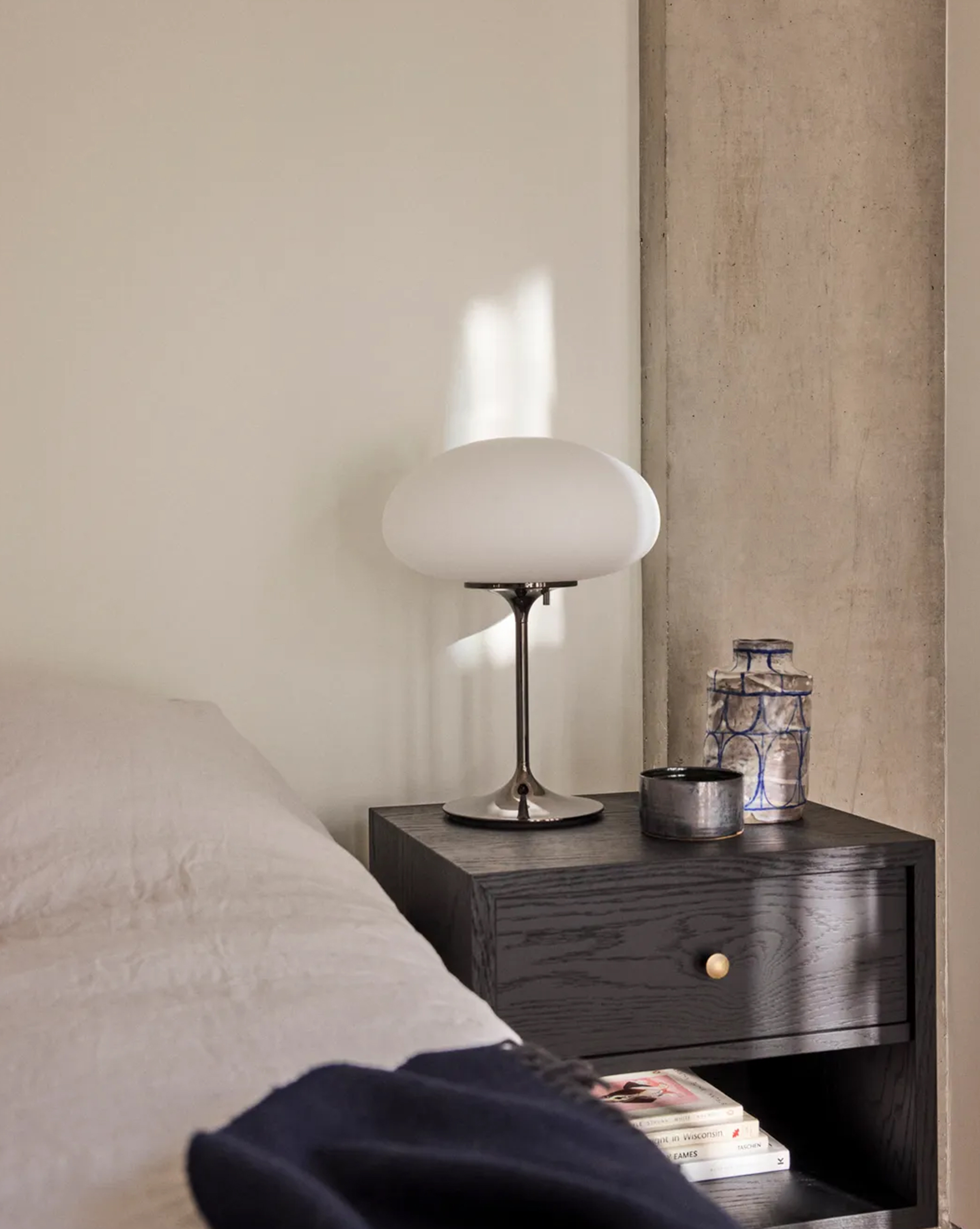 由傳奇設計師 Bill Curry 創造的 Stemlite 系列,散發出 1960 年代美國西海岸的時代精神。燈具以磨砂玻璃球營造柔和的氛圍光,下方旋轉調光開關,能自由調整光線強度。其簡約的細長燈桿,形如鬱金香莖部,為空間增添優雅的現代復古風情。