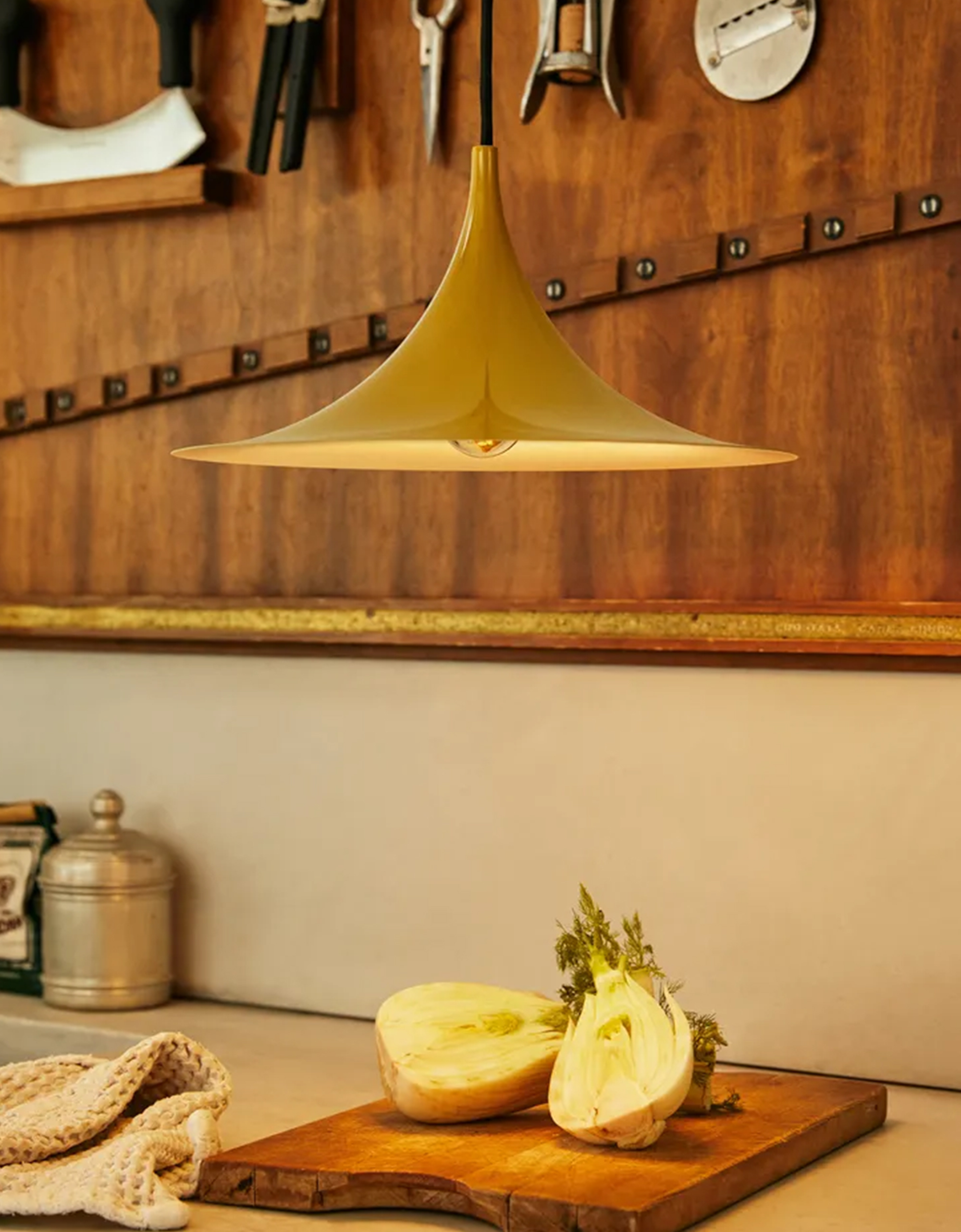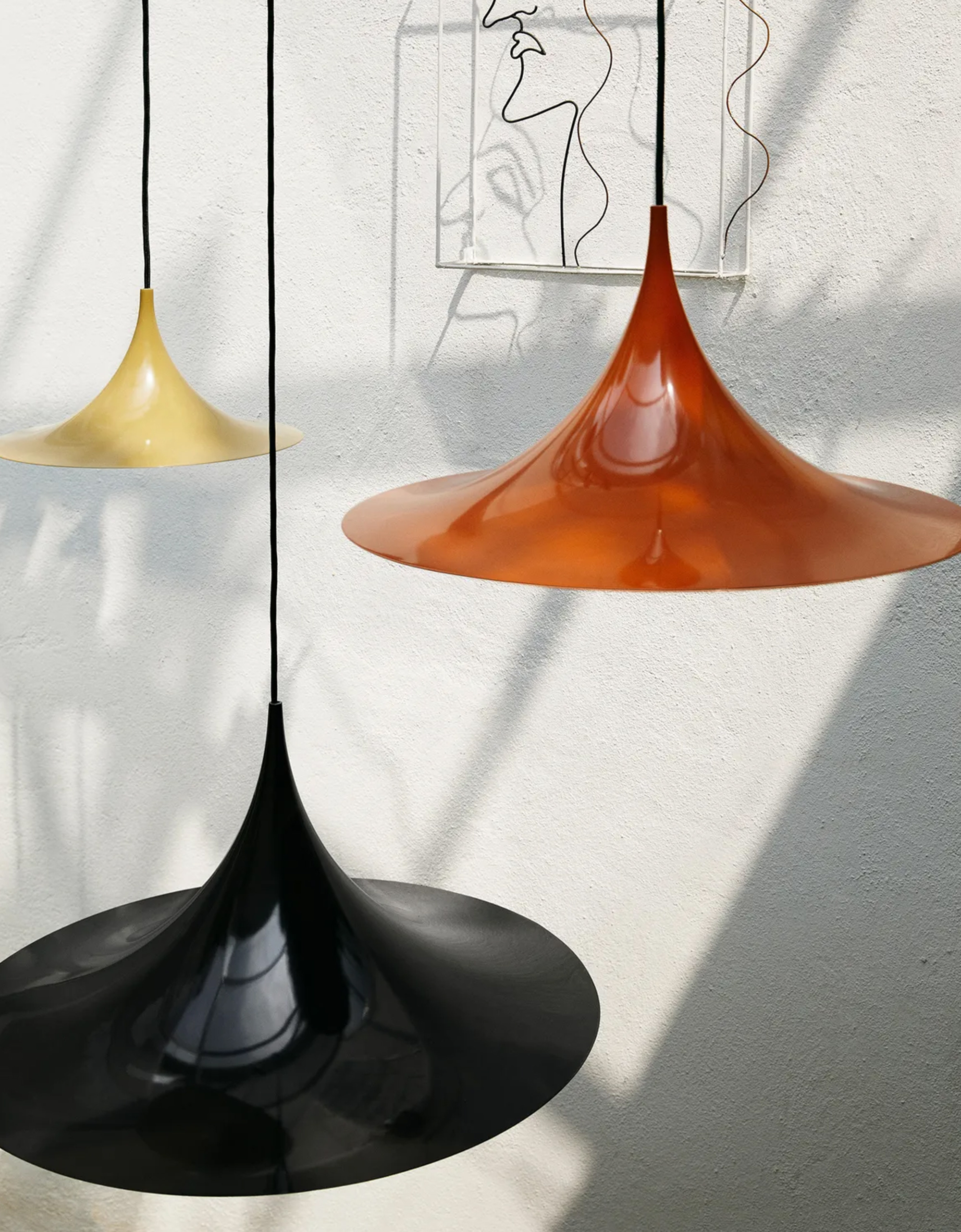 Semi Pendant 是一款獨特的吊燈,其設計基於兩個背靠背的四分之一圓弧組合而成。它獨特的拱形金屬燈罩經過琺瑯處理,能夠營造出擴散且呈錐形的光線,非常適合作為餐桌或廚房工作檯上的照明。憑藉其輕盈的外形、獨特且經典的設計,以及多樣的顏色和尺寸選擇,Semi Pendant 非常多功能,適用於私人及公共空間。