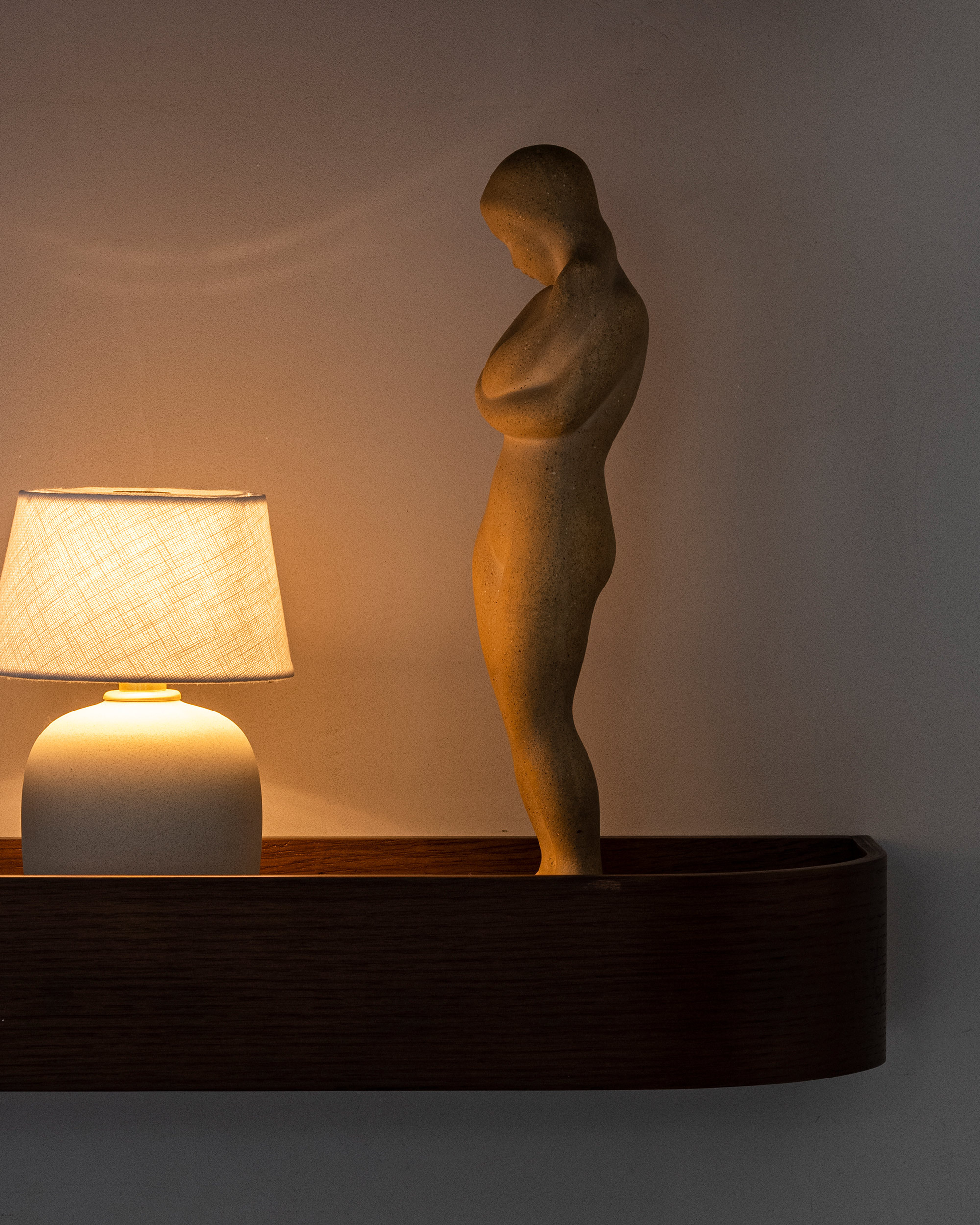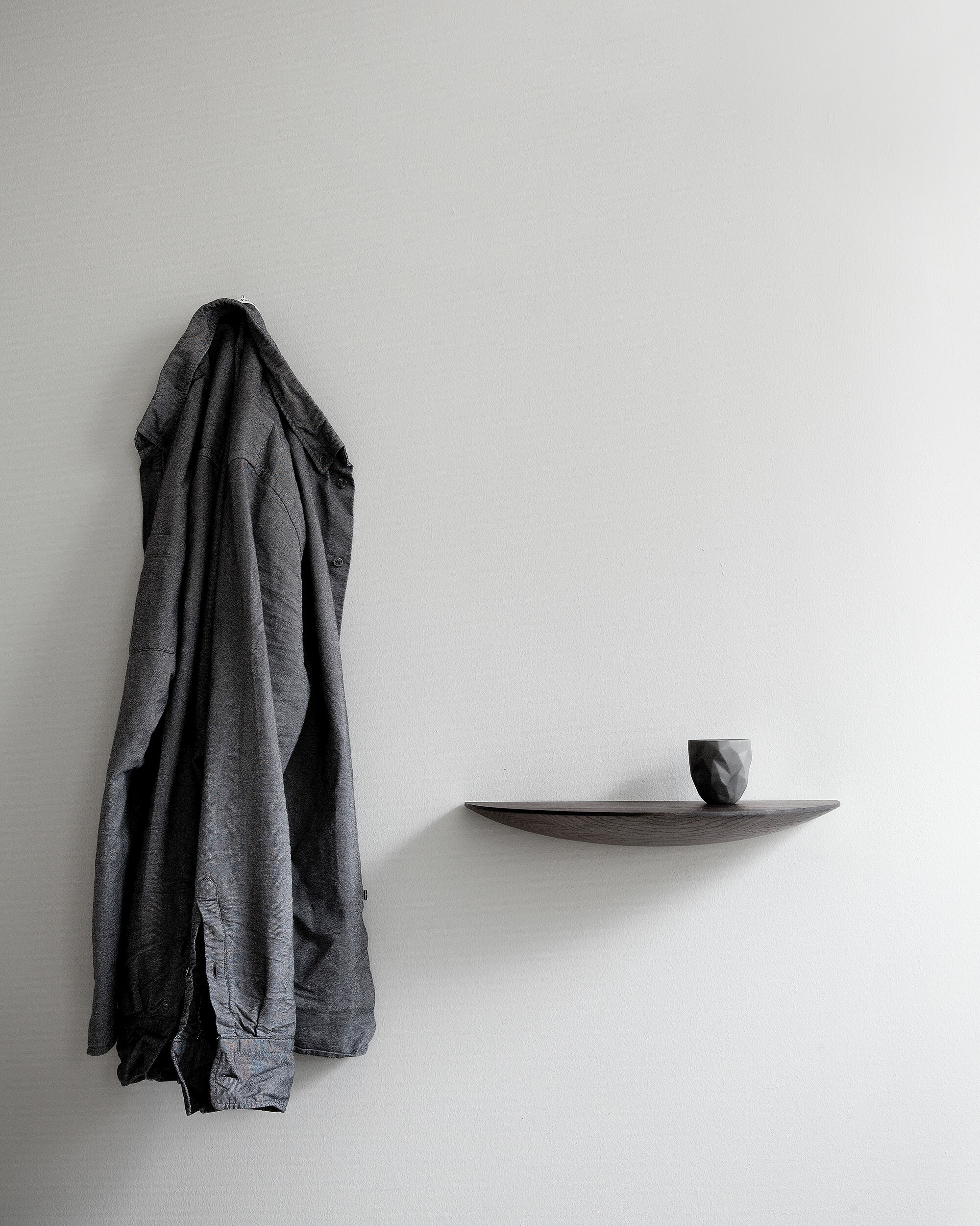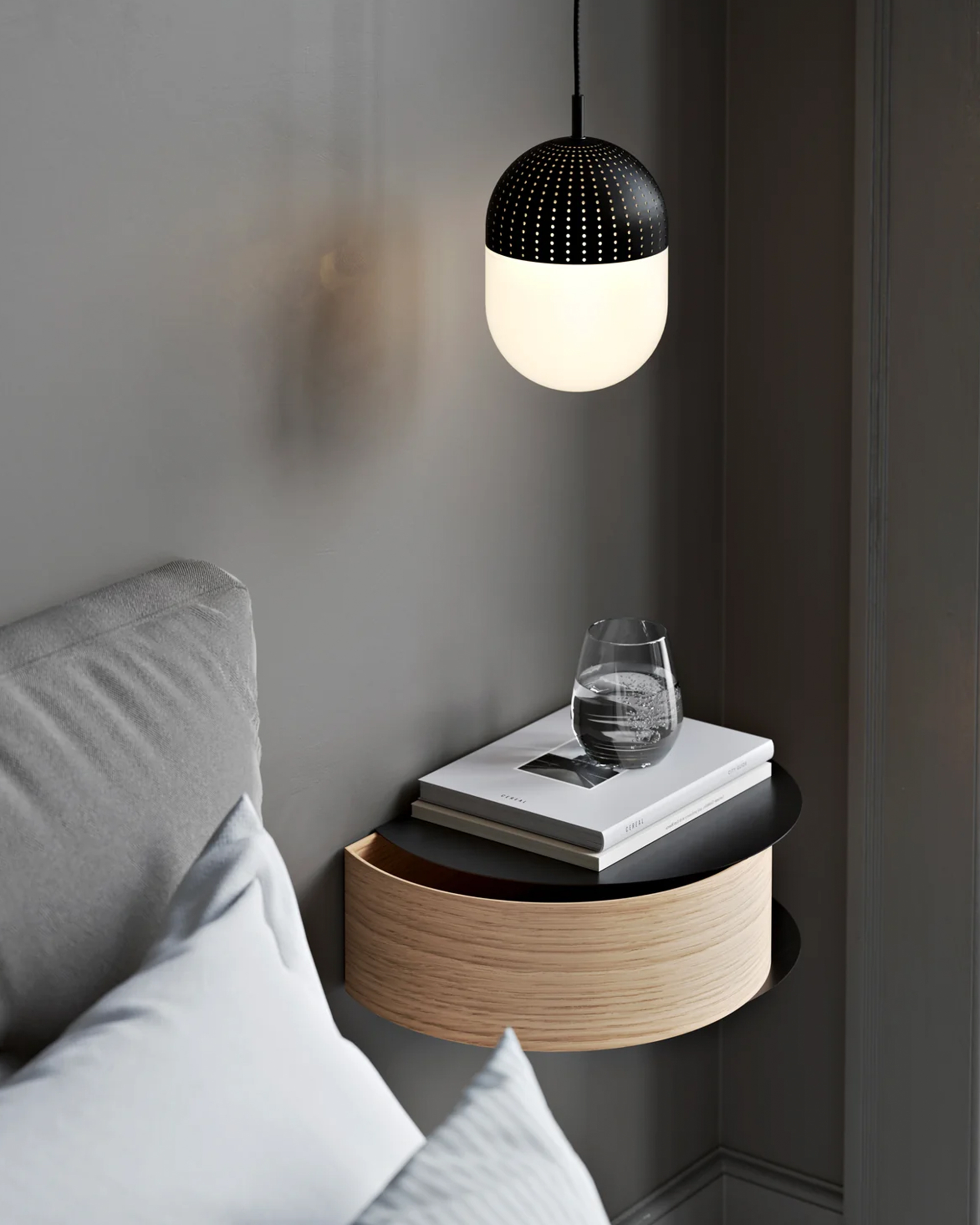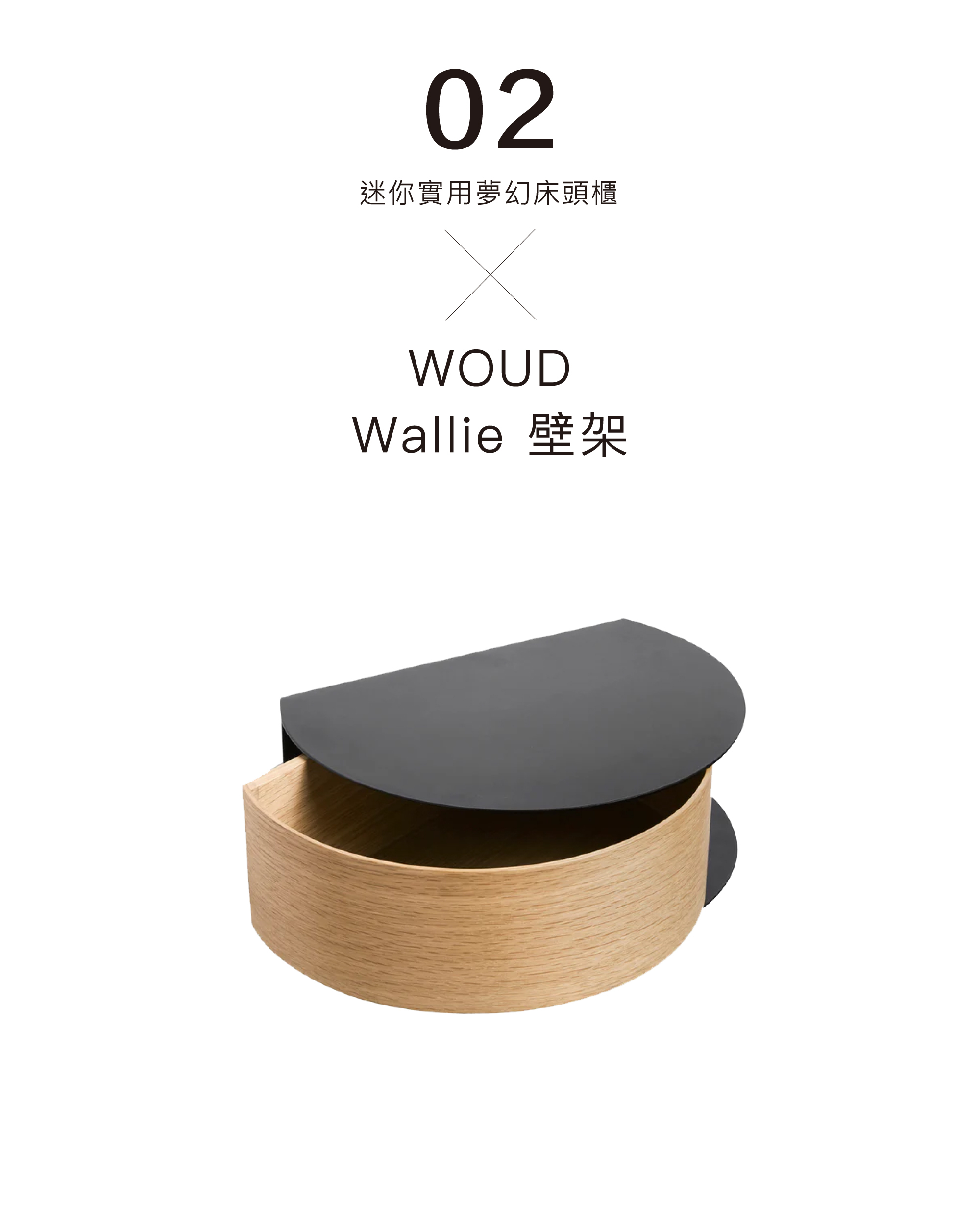 Wallie把彎曲的橡木和黑色金屬巧妙結合,打造出圓潤可愛的壁掛抽屜。它不僅能放小物和裝飾品,還有磁性抽屜,開關超方便!簡約又實用,讓你的床頭瞬間多了份俏皮感!