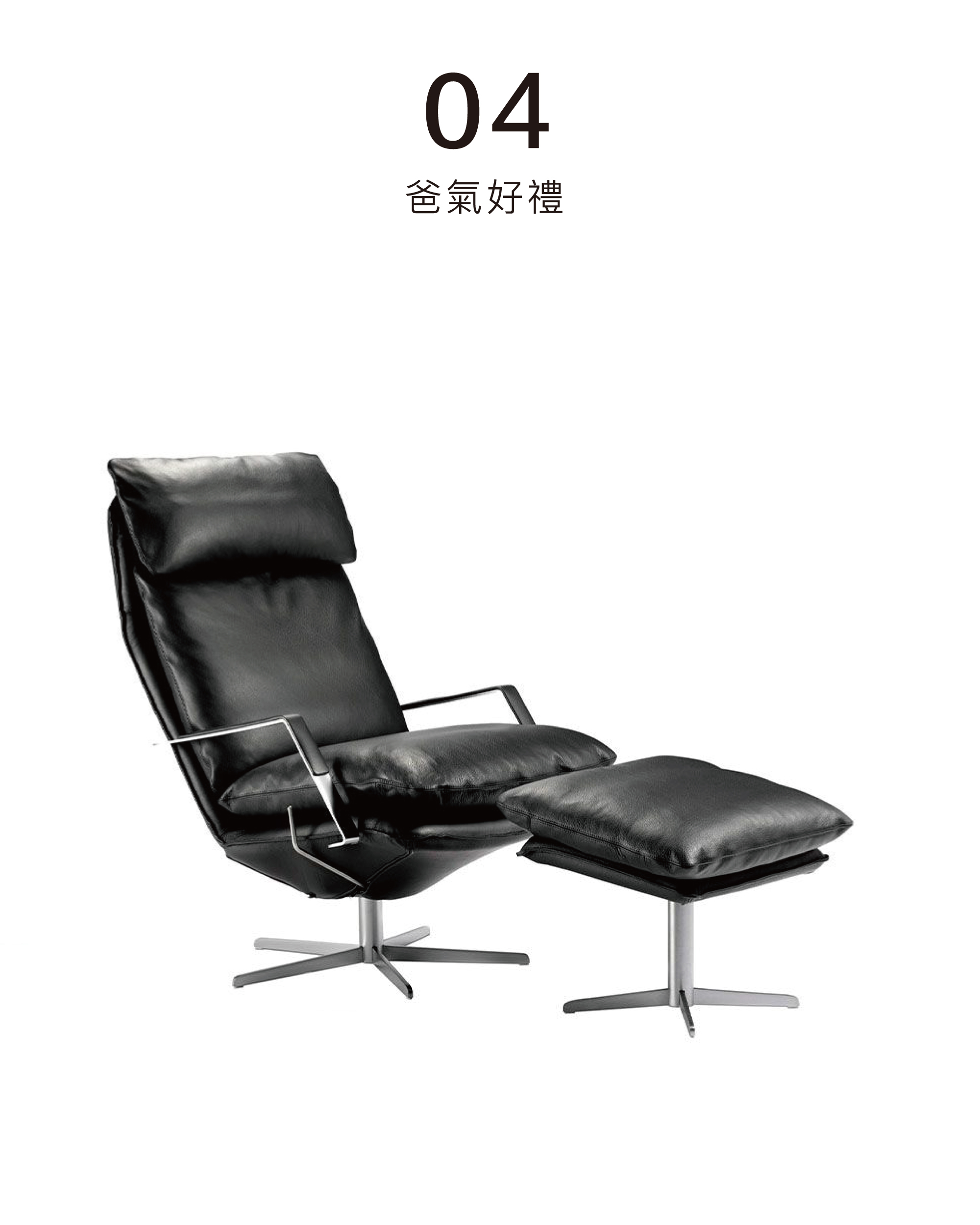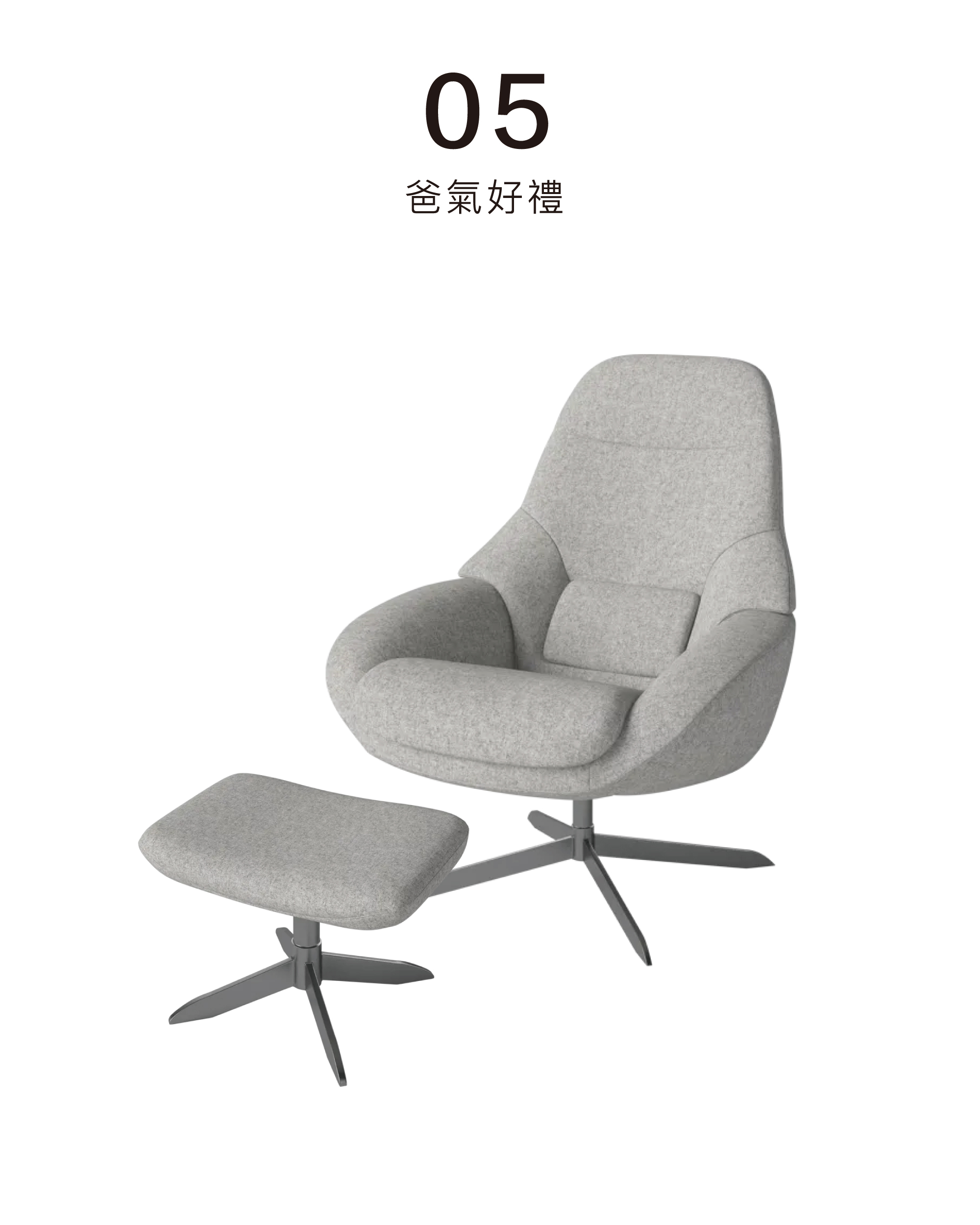 Dedo Lounge Chair 搭配 Dedo Footstool ,讓舒適感倍增。這組合不僅符合人體工學,還能完美支撐爸爸的背部和腿部,提供最極致的放鬆體驗。無論是工作後的休息還是周末的慵懶時光,這款單椅都能帶來極致的舒適。