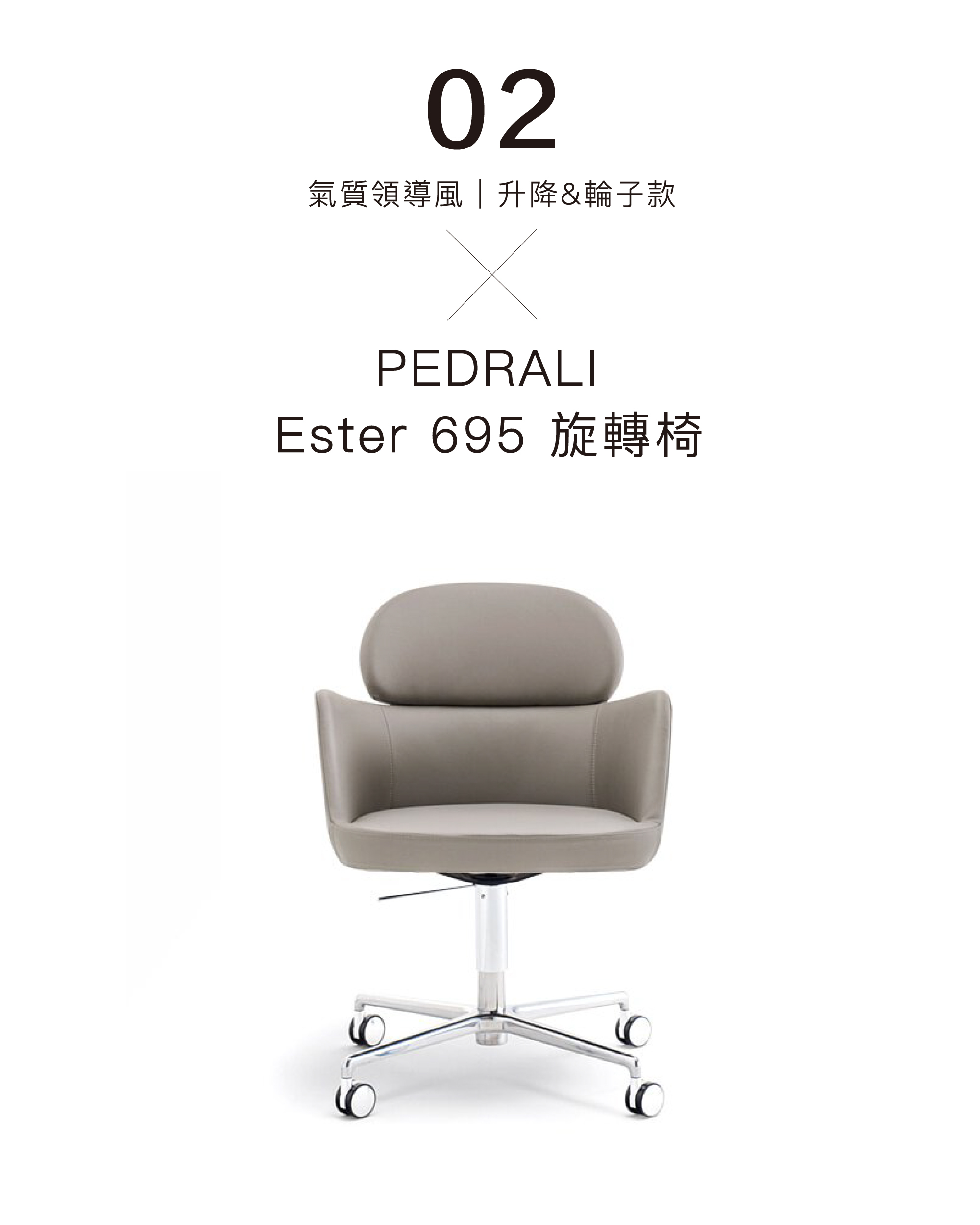 Ester 系列將優雅、人體工學與功能性完美結合,展現柔和優雅的線條,同時提供極致的舒適坐感。這款帶有氣體裝置的旋轉扶手椅,外殼以聚氨酯泡沫包覆,並搭配壓鑄四星十字鋁底座,確保平衡穩定的使用體驗。Ester 系列廣泛應用於各國高級餐廳、辦公室與飯店,彰顯不凡的品味與格調。