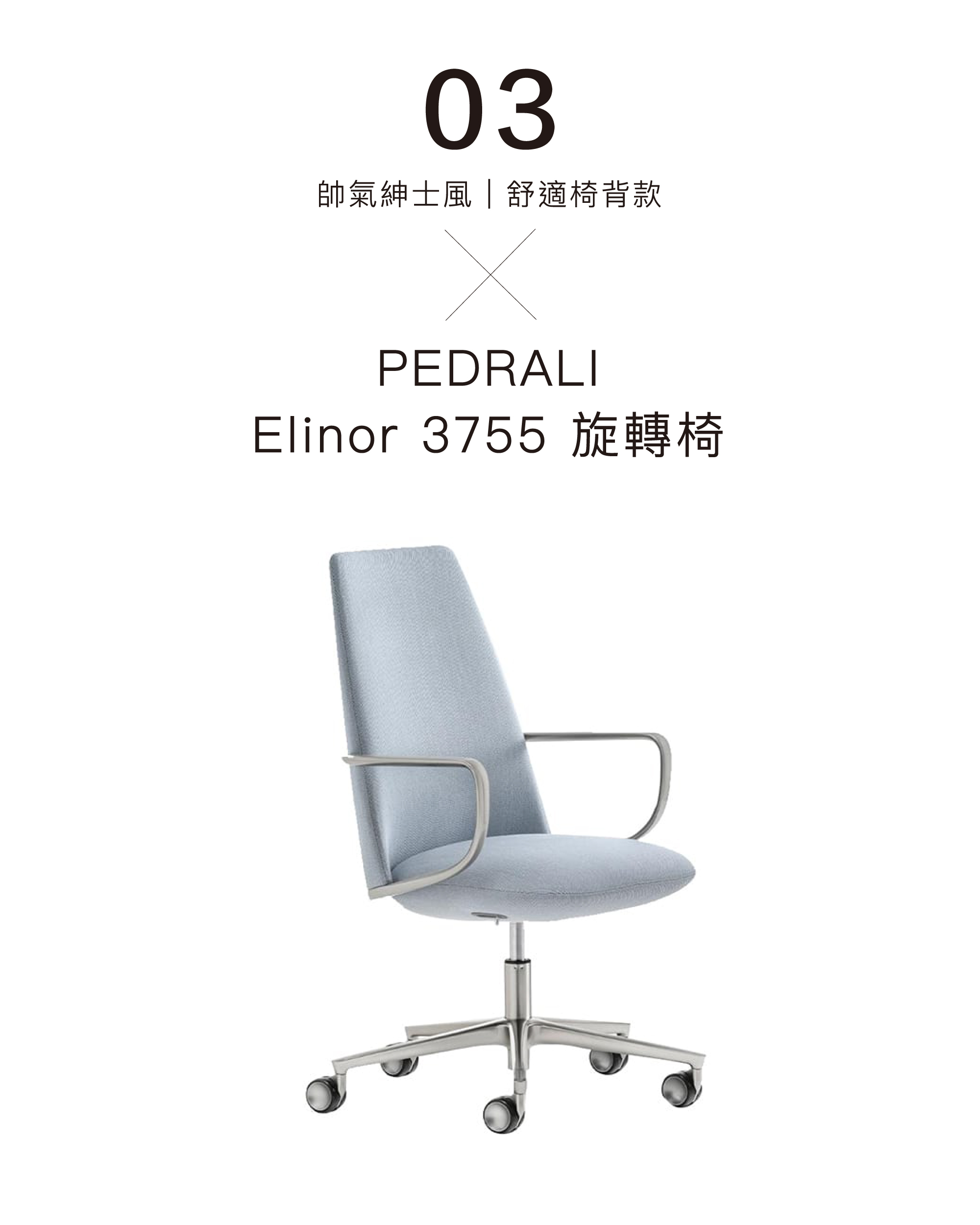 Elinor 座椅提供了理想的支撐強度,並兼具舒適性與包覆感。座椅內建氣舉裝置,能依據用戶體重自我調節,讓背部保持最舒適的姿勢。壓鑄鋁扶手以輕巧而堅固的設計,透過流暢的線條勾勒出靠背底部輪廓,展現出優雅的簡約風格。這款講究細節的皮椅,最適合西裝筆挺的你。