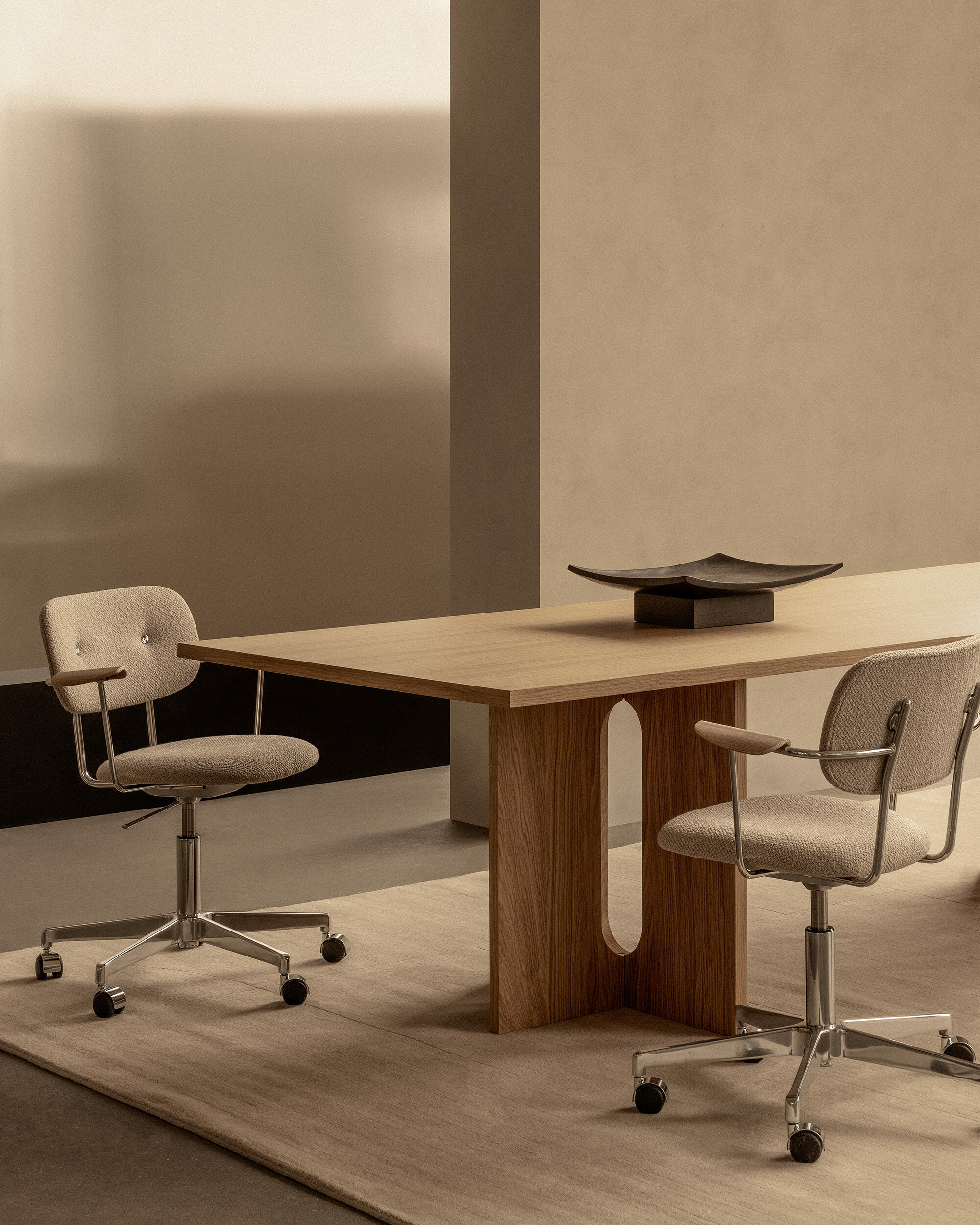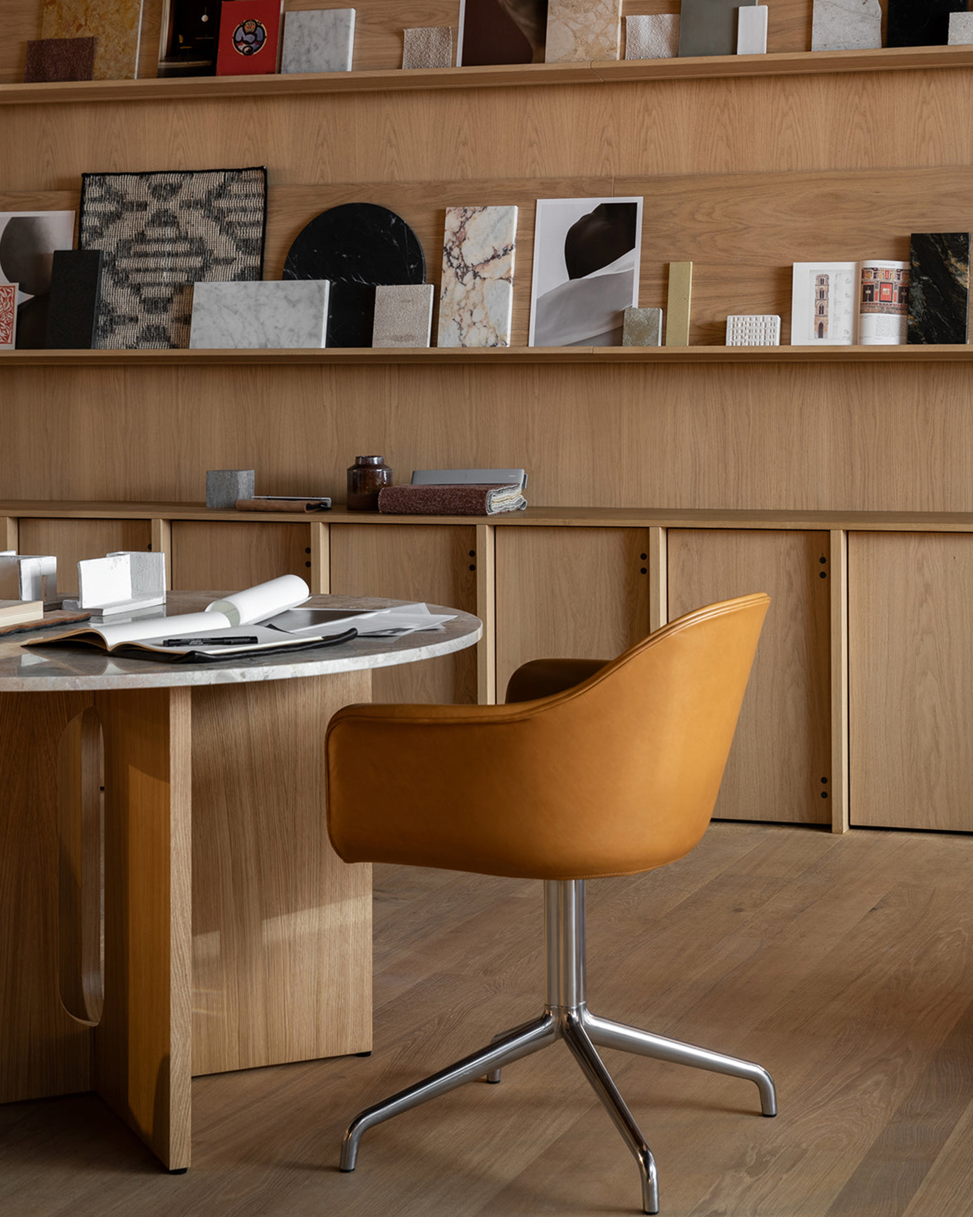 Norm Architect 成立於2008年,專注於建築、室內與工業設計。其作品強調質量、耐用性與永恆美學,結合天然材料與卓越工藝,展現簡約與歷史美感。與 Menu 長期合作,設計出符合人體工學的扶手旋轉椅,提供舒適且優雅的辦公體驗,適用於辦公室與會議室,並有多種旋轉方式與材質選擇。