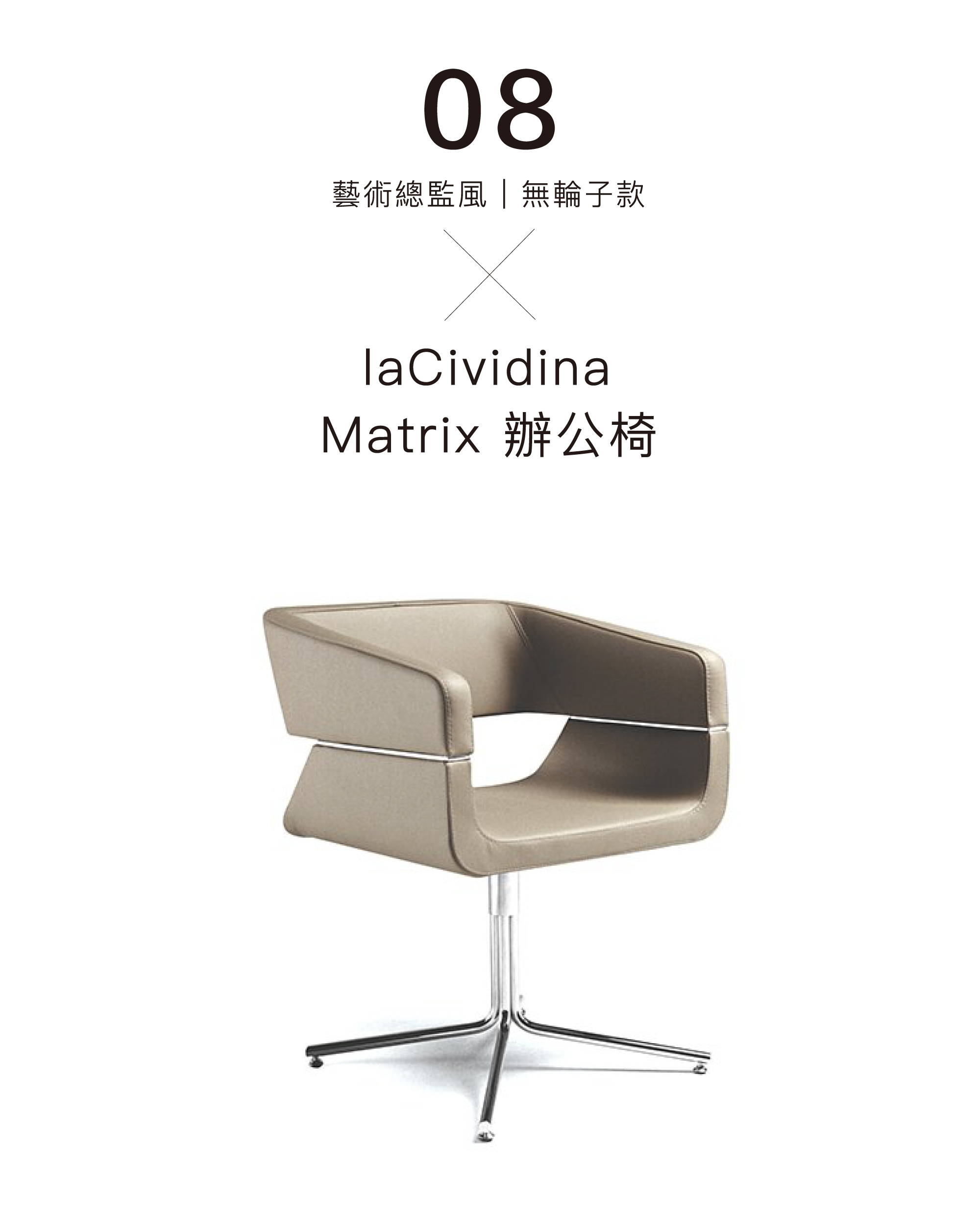 laCividina 創立於1976年,展現義大利製造的高品質。Matrix 辦公座椅具未來風格,輕盈線條與中空結構,極具藝術性,彷彿一坐上就會有許多大膽且創新的提案想法冒出來。
