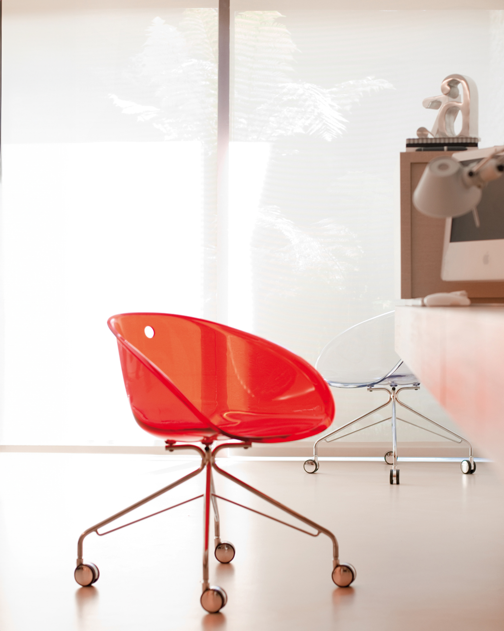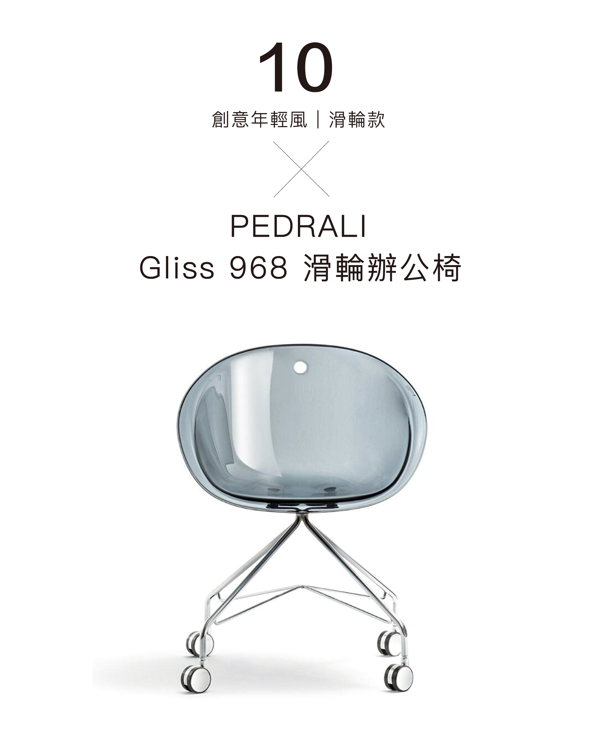 Gliss 椅款造型摩登且符合人體工學,靈感源自50年代經典設計。塑料材質外殼帶有獨特的圓形孔洞,彎曲扶手提升了舒適性和功能性。座椅易於抓握,弧形外殼如同擁抱身體,顏色像極了腦中七彩的繽紛創意。