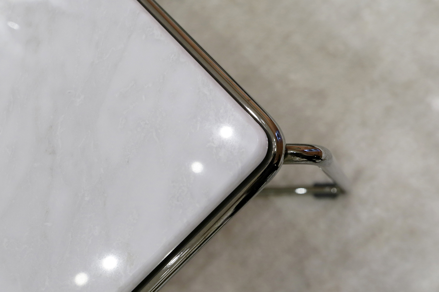 以纖細俐落的金屬桌腳穩固支撐著大理石或玻璃桌板
