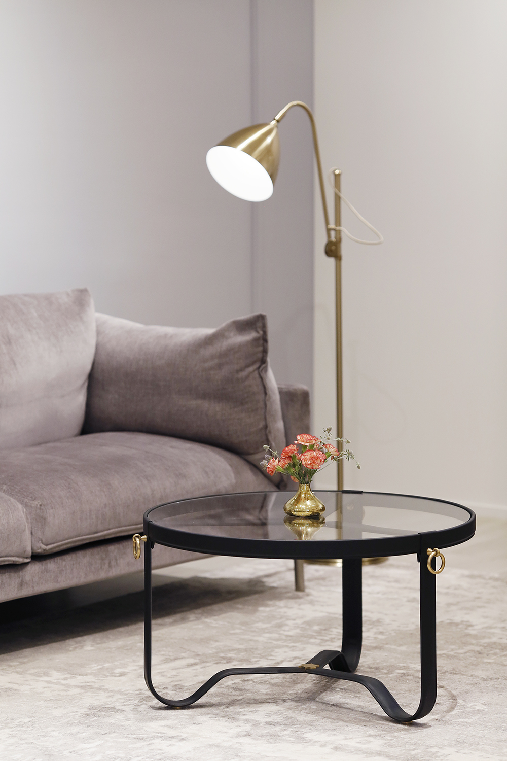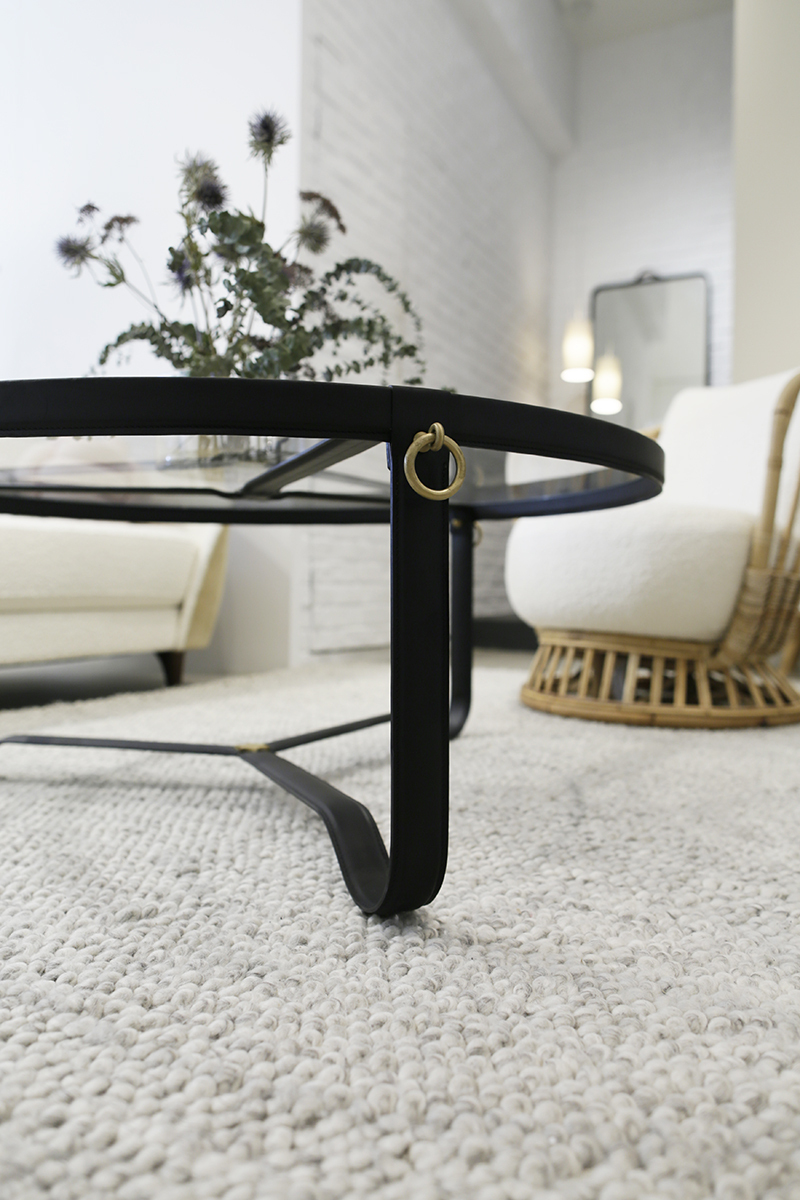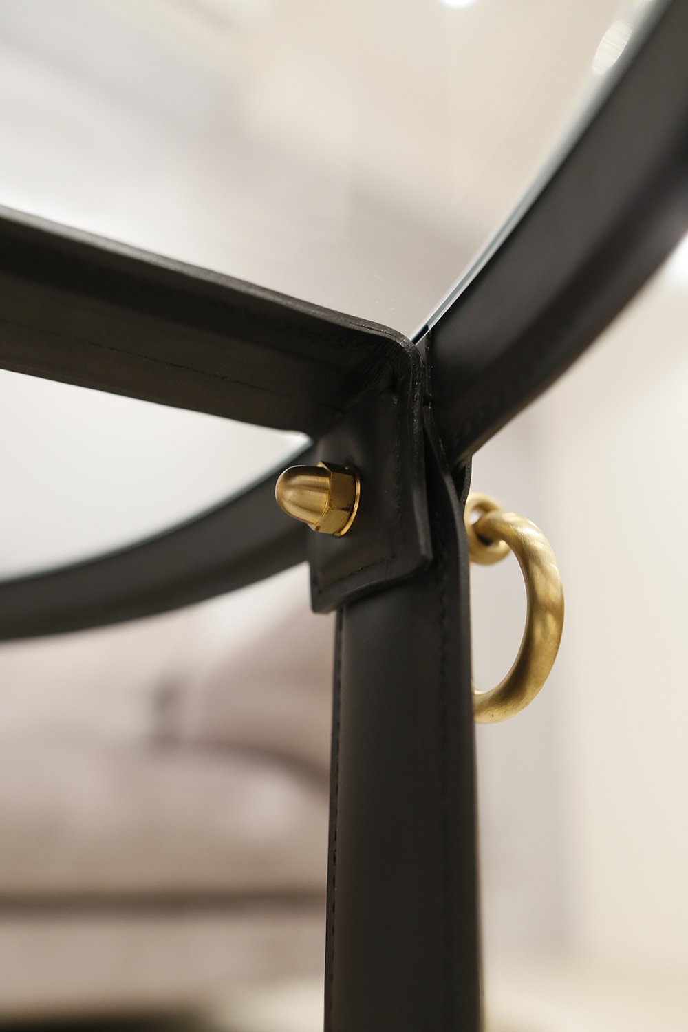 流暢的椅腳與玻璃桌面相接處以馬具專用的黃銅環扣做為裝飾