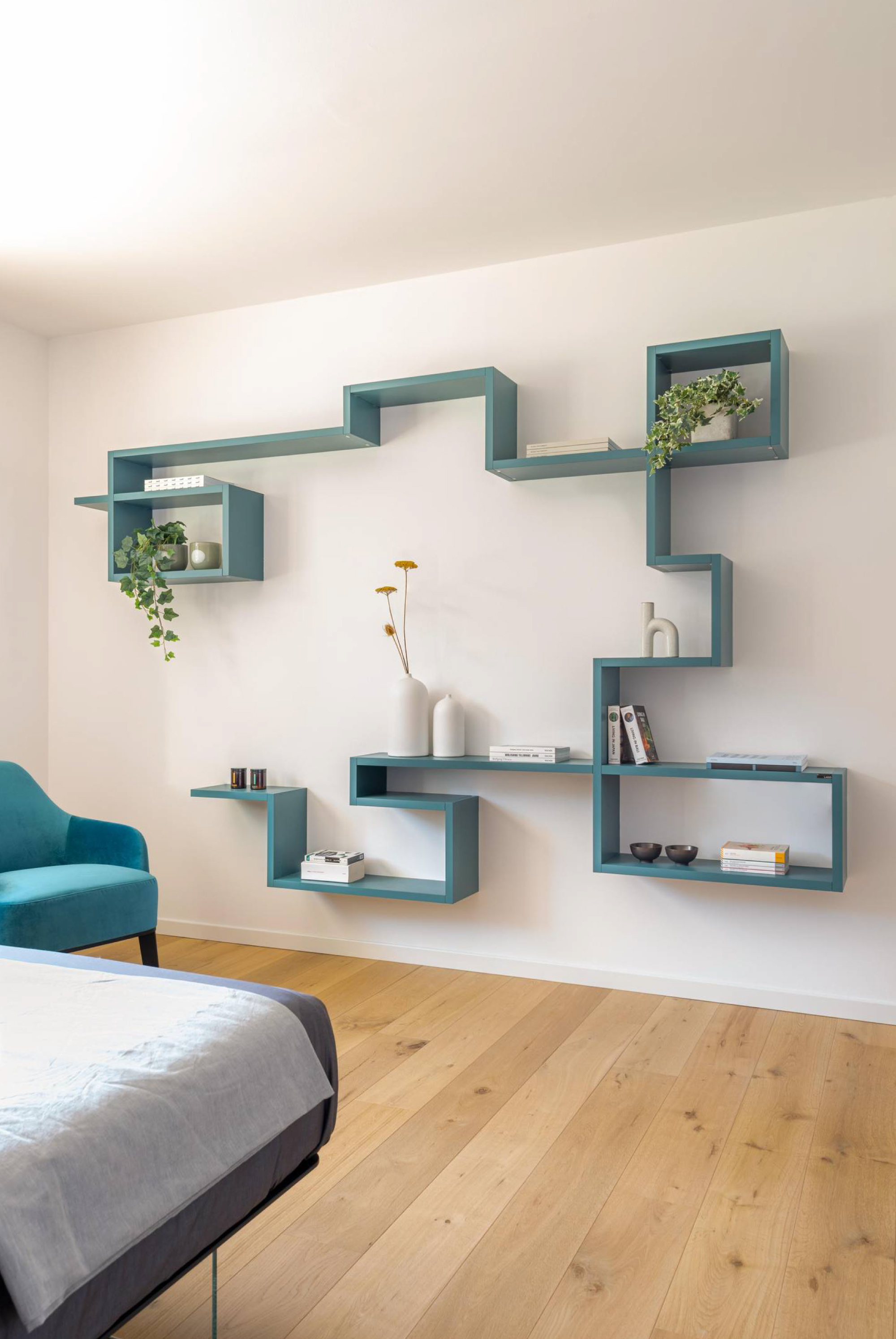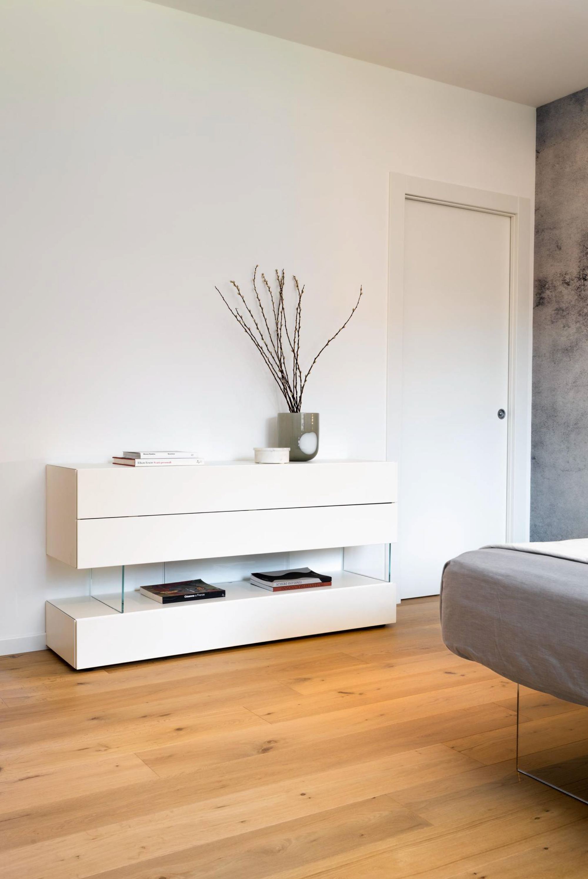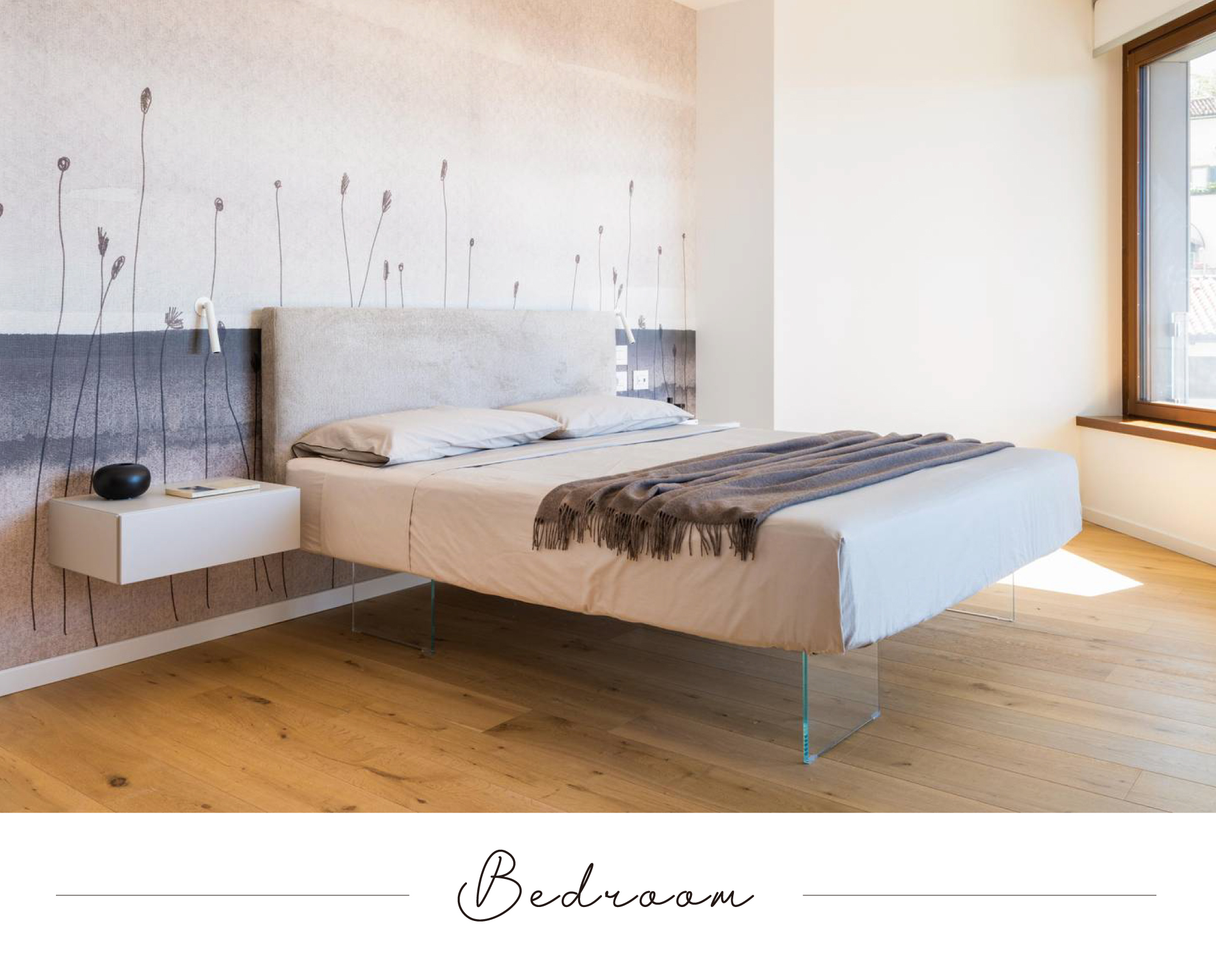 轉身來到臥室,同樣使用 Air 系列玻璃的床架,讓整個空間猶如一幅現代畫作,輕盈卻又令人安心的臥室,如同在雲朵上睡著一般夢幻。