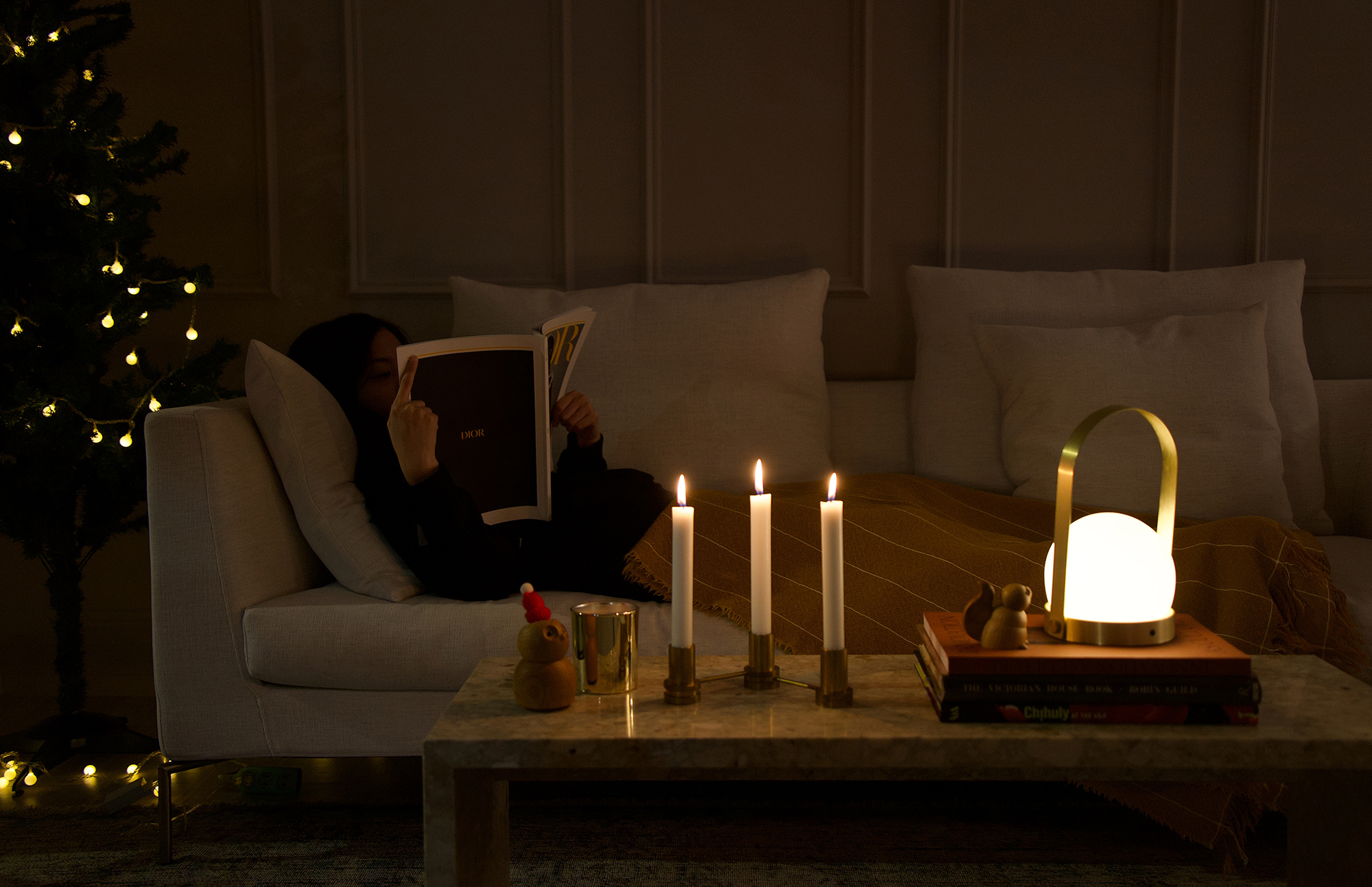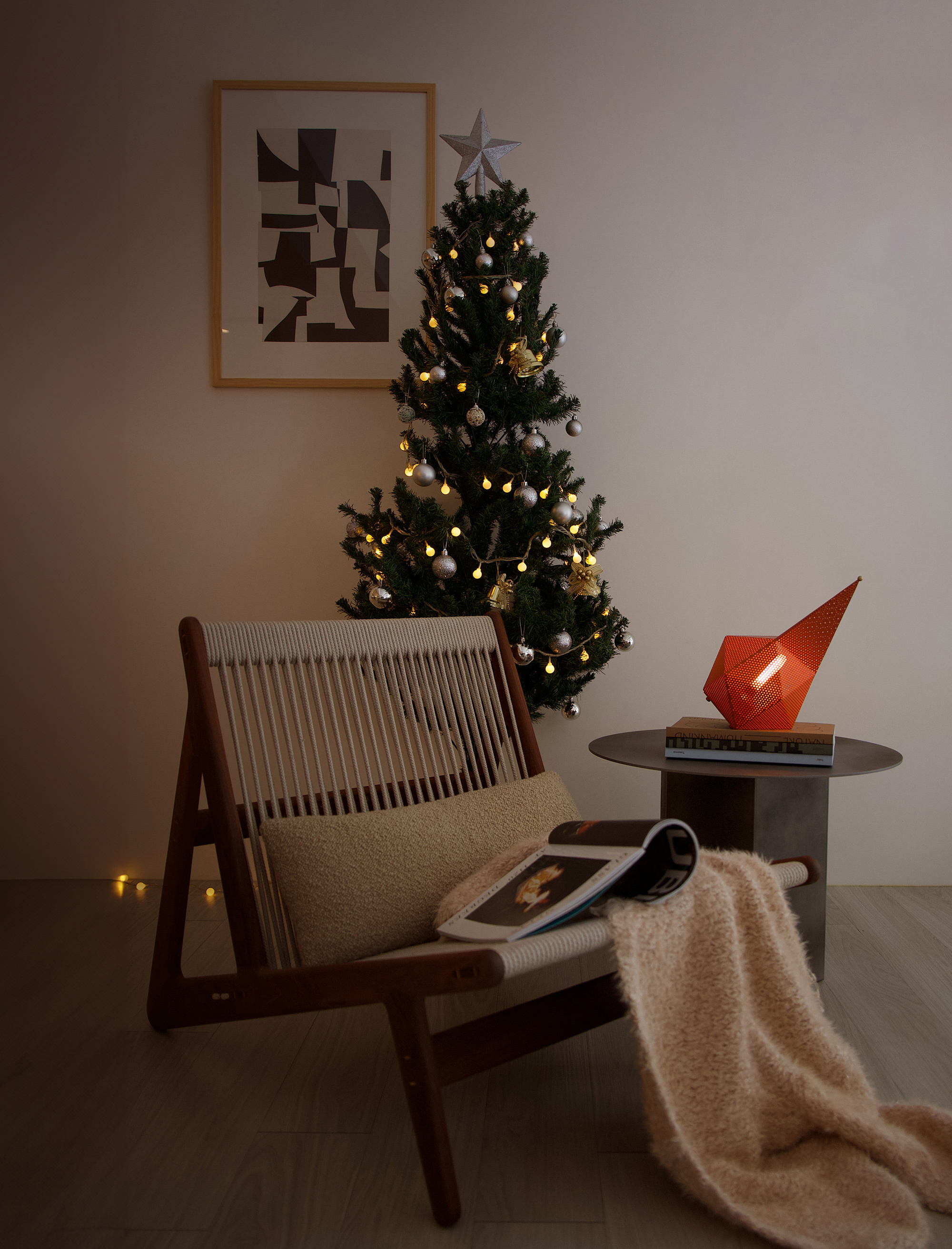 Norm Architects 設計的 Plinth 茶几,不僅是空間中的雕塑,更是承載節日氛圍的基石,典雅的線條與精緻的打磨使其成為客廳的視覺焦點。Carrie 提燈以流暢的造型與 USB 充電功能,輕鬆提供 10 小時光照,無論是床邊、茶几上,還是派對上的輕鬆小角落,都能點亮溫馨情調。