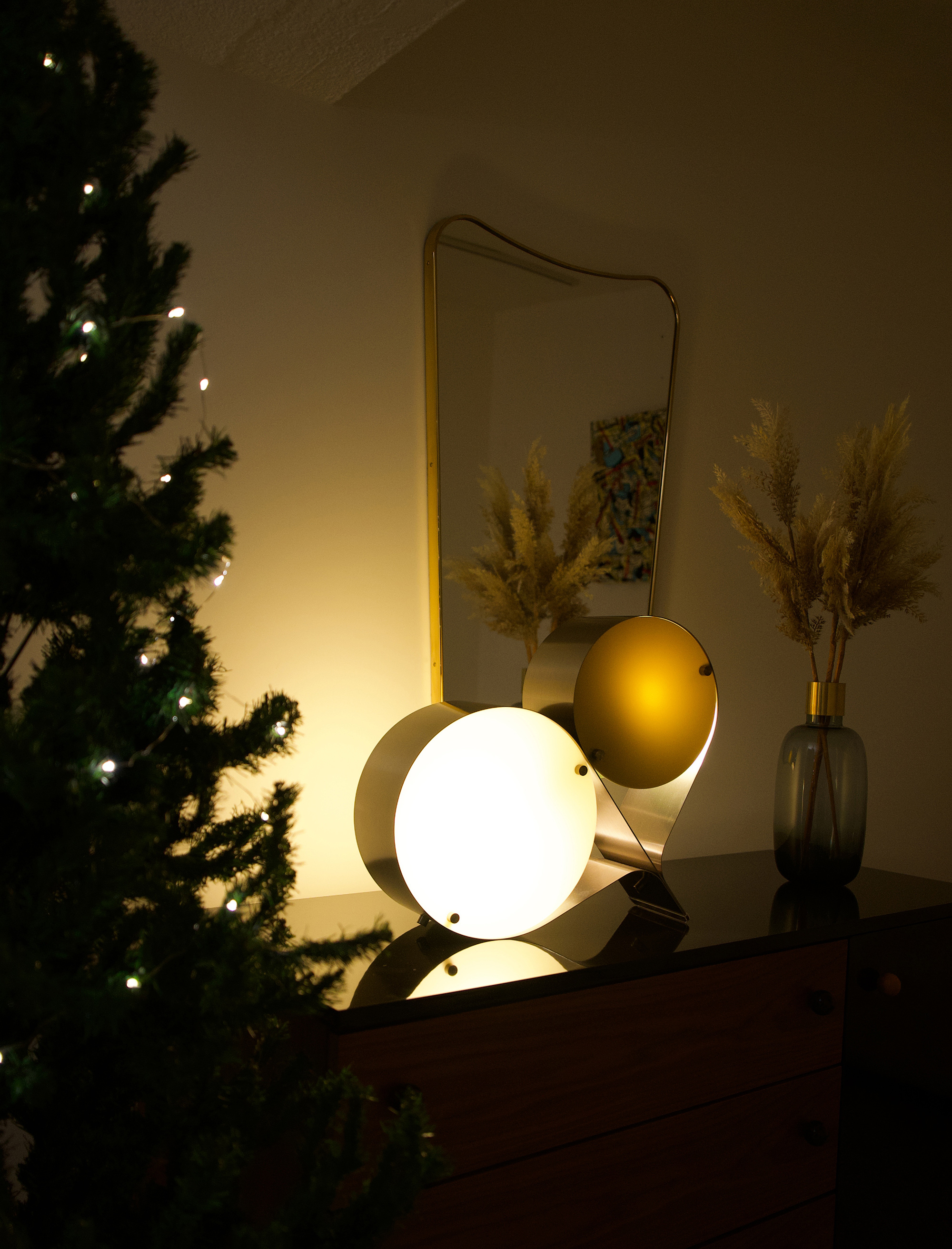 由設計師 Vibeke Fonnesberg Schmidt 手工打造的 Coppia 桌燈,以幾何圖形為靈感,完美平衡設計與雕塑美學。名稱來自義大利語「情侶」,燈具設計融合有機玻璃圓盤與黃銅固定件,散發出濃厚的 20 世紀 50~60 年代懷舊韻味。這款燈具富含藝術感與工藝感,不僅是一盞燈,更是玄關中的藝術品。