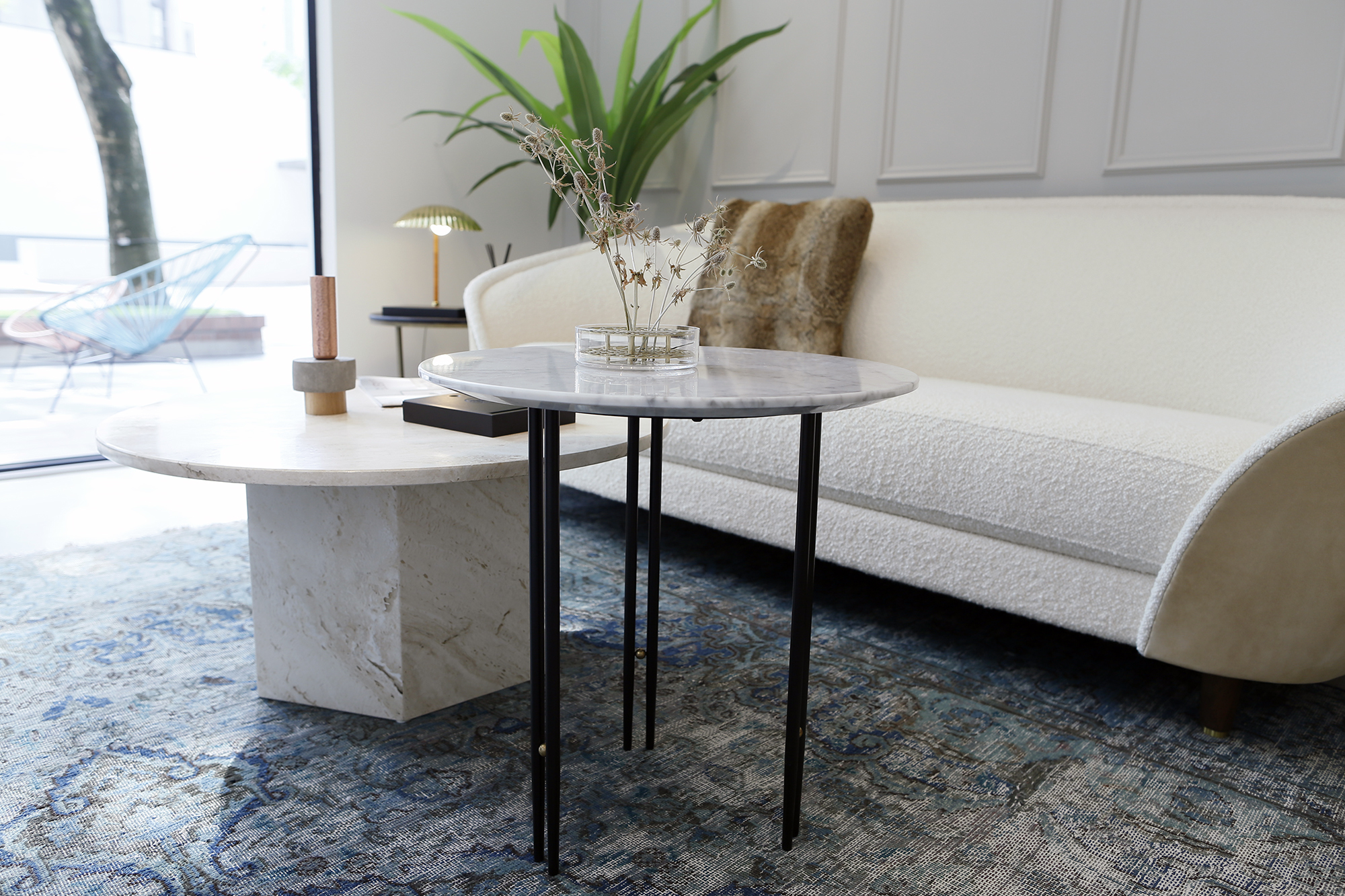 IOI茶几由纖細的金屬桌腳與大理石桌面所構成
