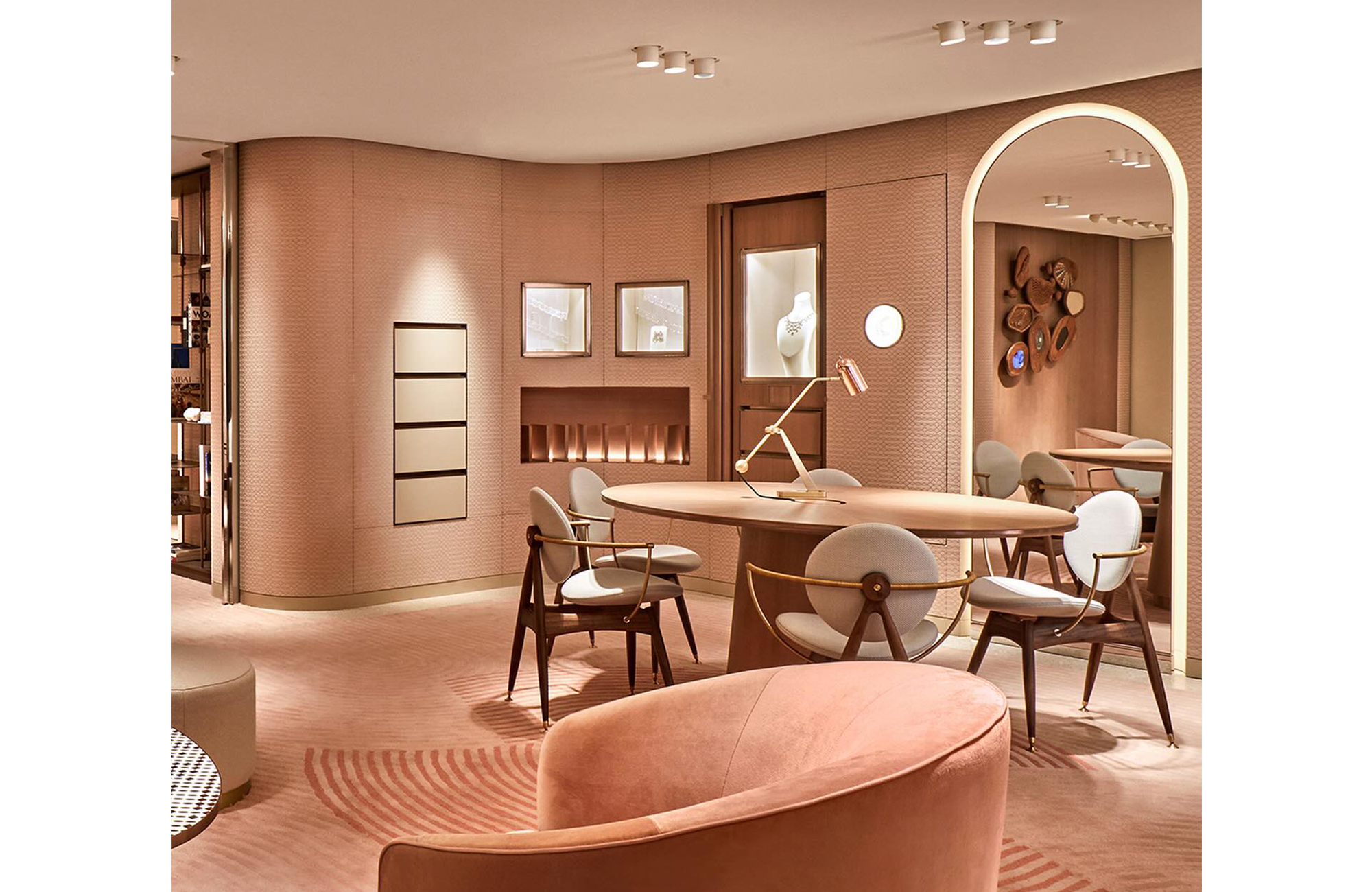 Circle 扶手吧檯椅作為品牌經典之作。每把椅子皆由頂級實木、精緻金屬與細膩皮革製成,並擁有專屬的序列編號,新創數控機械技術與傳統工匠手工技法融為一體,彰顯獨一無二的珍貴價值。在 Aneka 的旗艦精品店內,Circle 扶手吧檯椅不僅是一張椅子,更是一件藝術品,與周圍的珠寶展示相輔相成,將空間美學提升到一個新的高度。