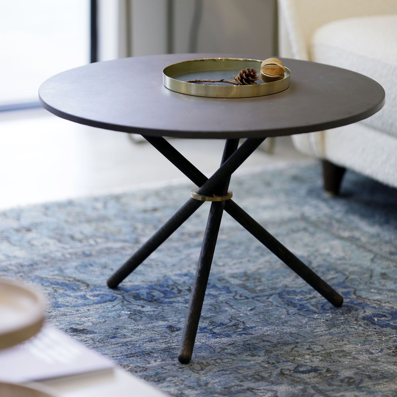 由混凝土桌面、優質的木腳及黃銅金屬固定環等材質相結合的EBERHART的Daphne 咖啡桌