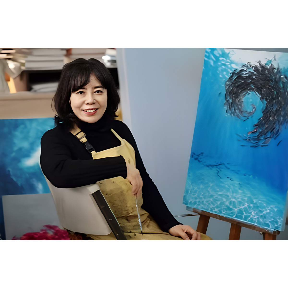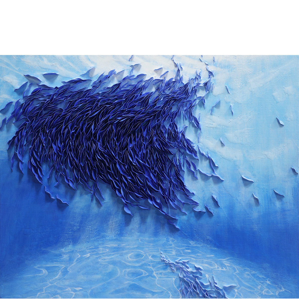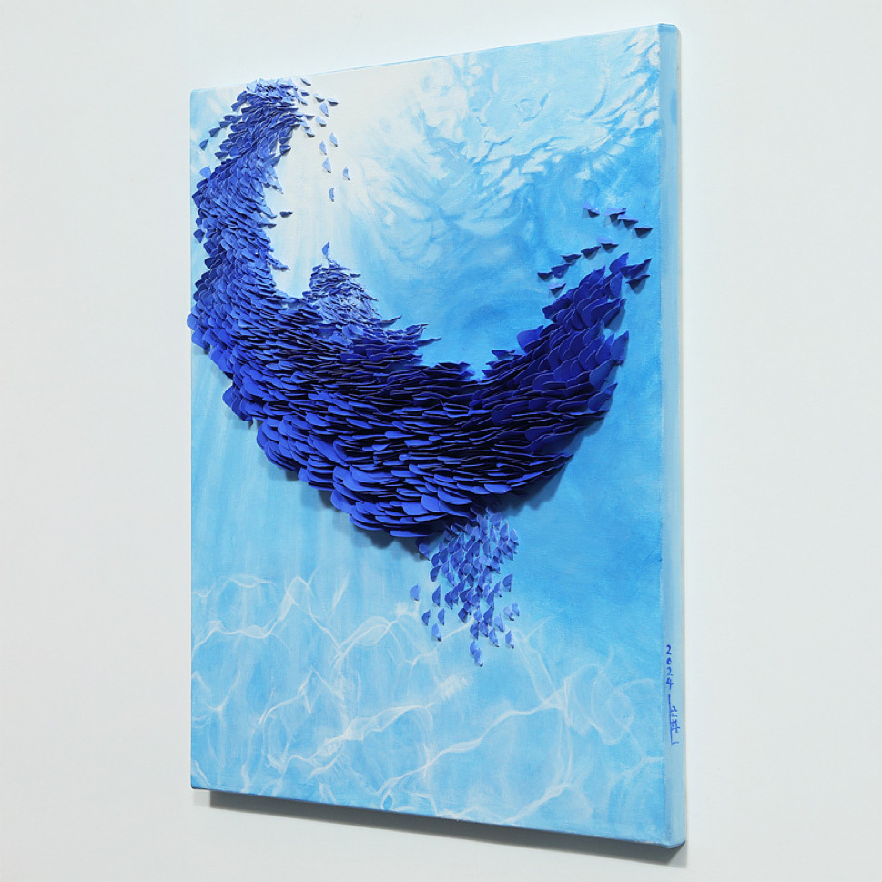 對藝術家而言,海洋的神秘如同遙遠未知的宇宙,充滿無限可能與探索價值。她希望透過作品表達自己對海洋的熱愛,即便這是一場永無止境的追尋,她依然滿懷熱情地投身其中,反覆潛入海中,試圖留下與這片深藍共處的美好痕跡。今夜,她或許又將徹夜不眠,只為捕捉那游動於深海中的魚群,展現其鮮活的生命力、能量流動與生存本能,並將這一切形象化地呈現於畫布之上。她的作品讓觀者彷彿置身真實的海洋之中,沉浸於那既真實又夢幻的深層幻象。