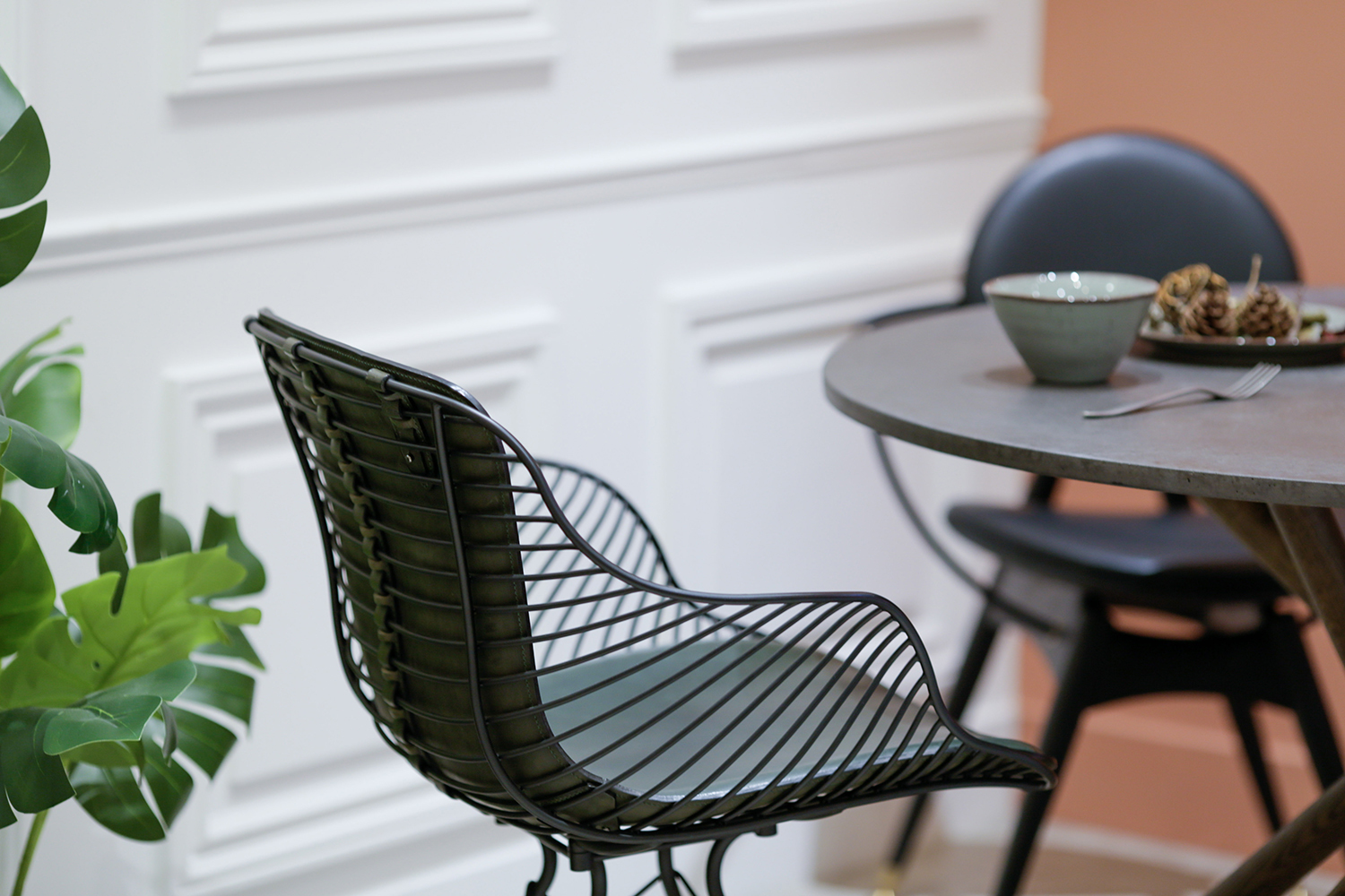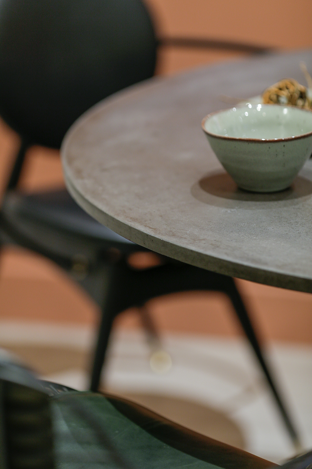 暗色的水泥桌面可擺放木質或是有著自然紋路的釉彩餐具